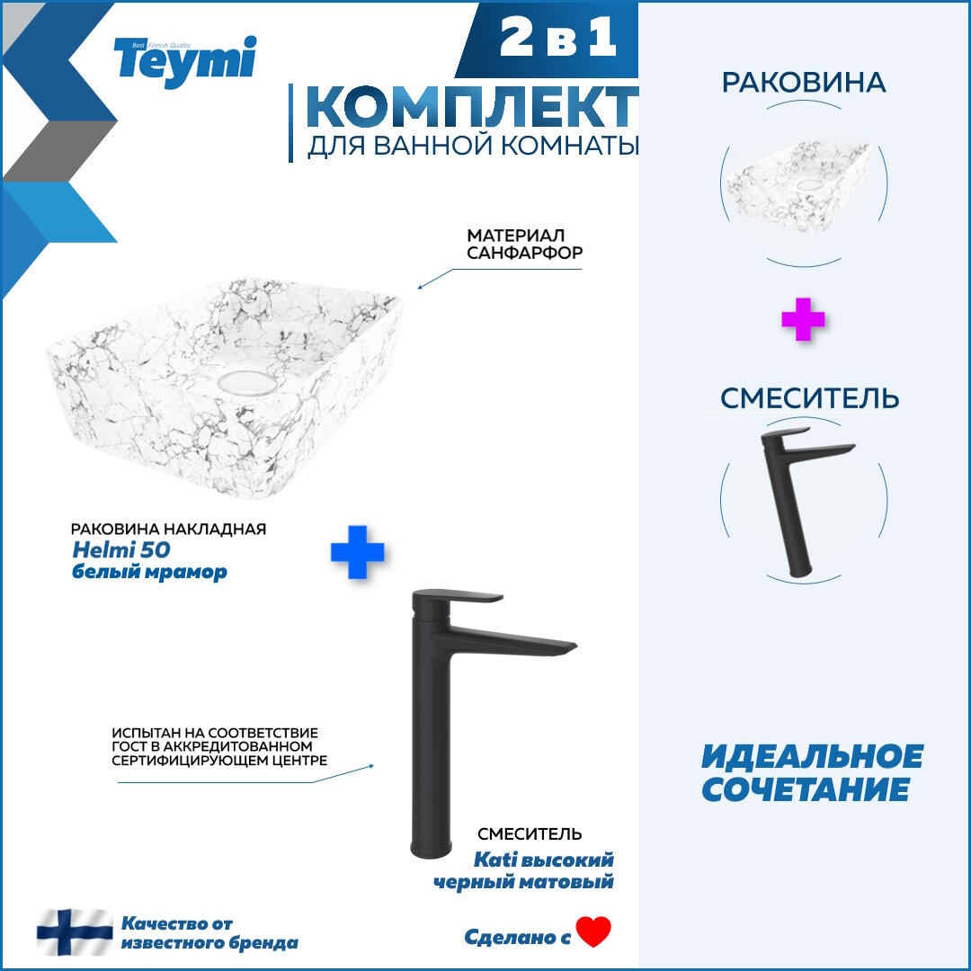 Купить Раковина для ванной накладная Teymi Helmi 50 белый мрамор в комплекте смеситель высокий черный матовый F12978