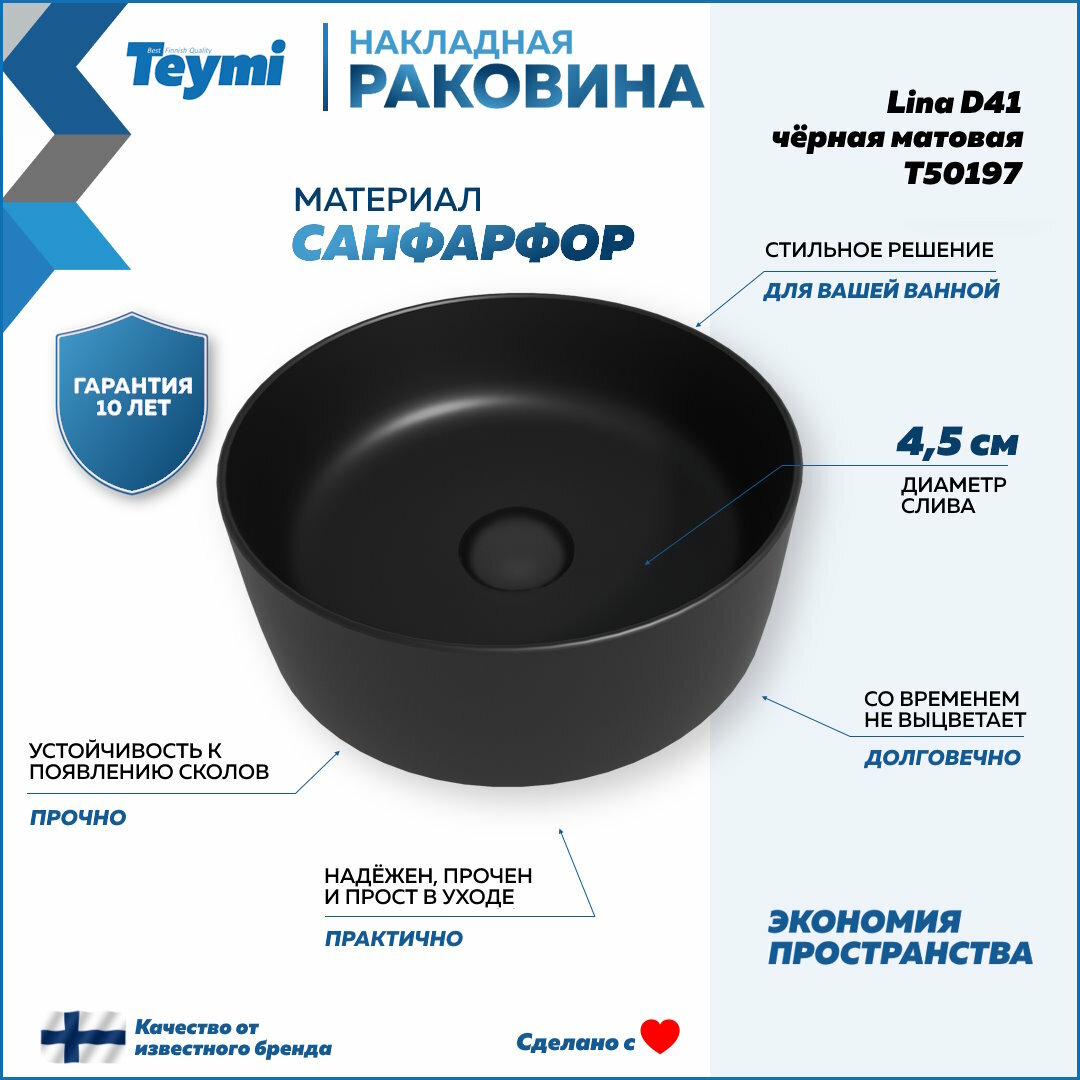 СохранитьРаковина для ванной накладная Teymi Lina D41 черная матовая в комплекте смеситель высокий черный матовый F12970 интересное: