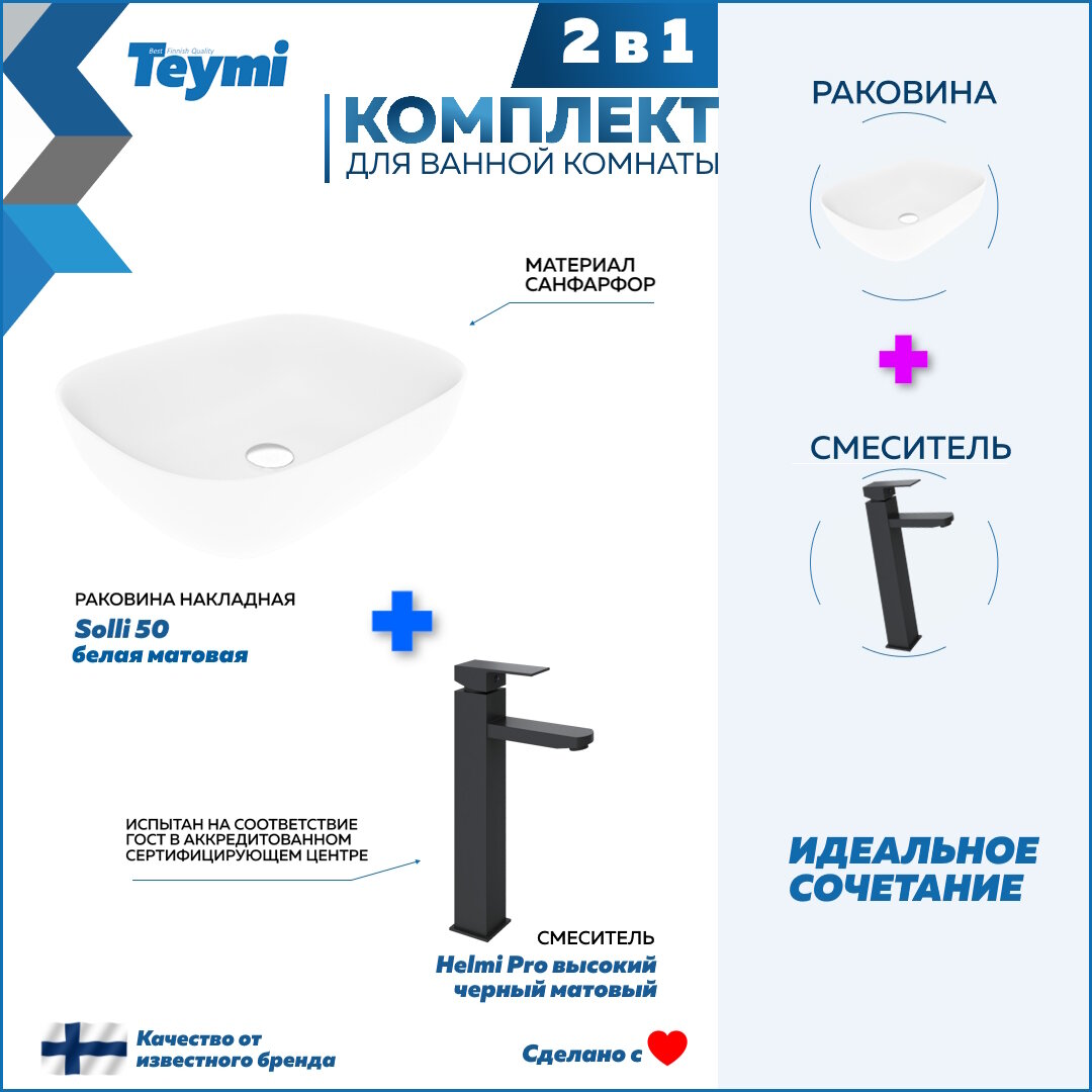 Купить Раковина для ванной накладная Teymi Solli 50 белая матовая в комплекте смеситель высокий черный матовый F12829