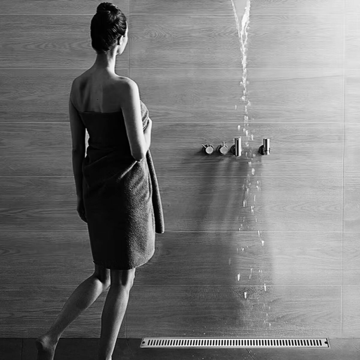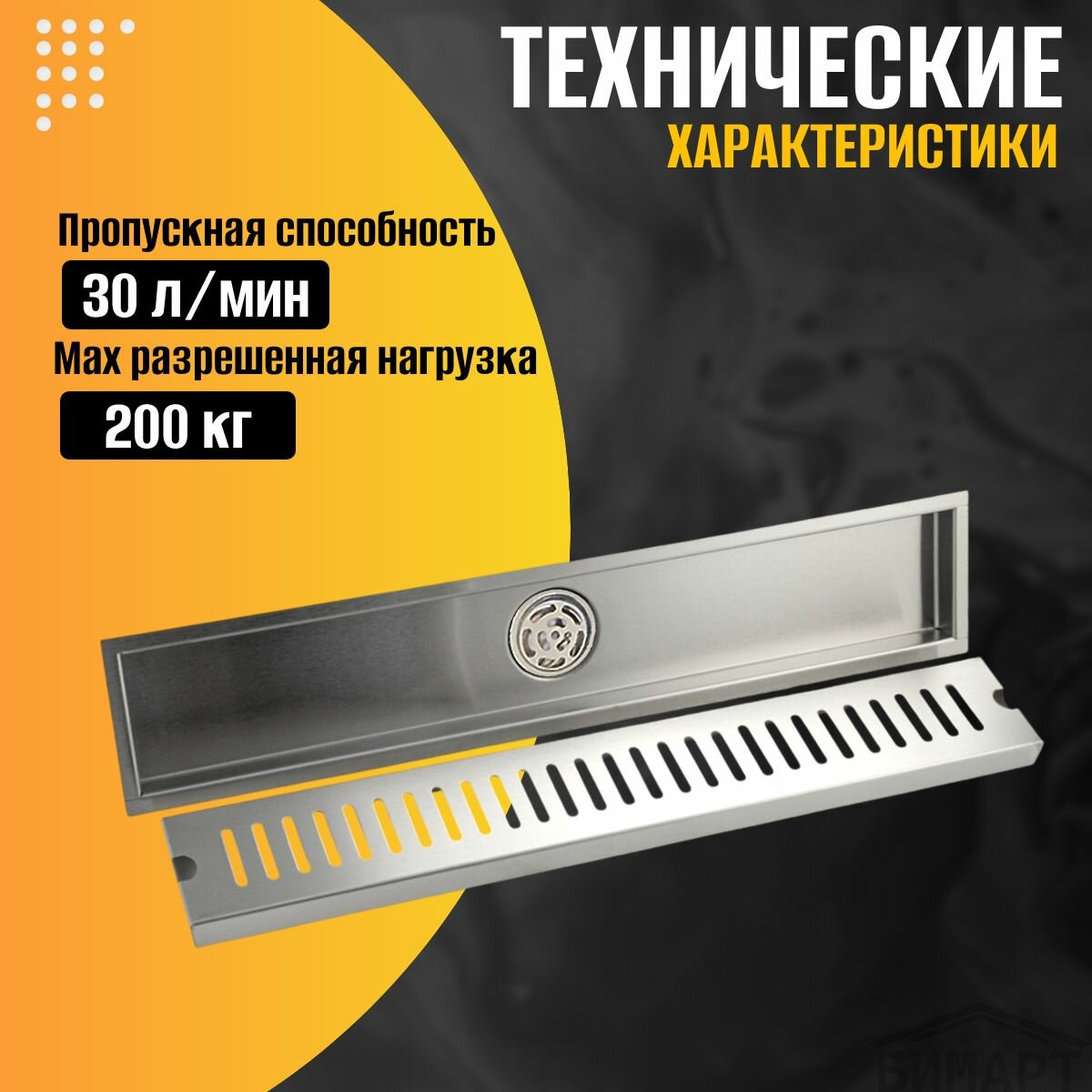 Трап линейный хром,600х100мм, душевой лоток с сухим затвором, из нержавеющей стали, с вертикальным выходом и с зазором под плитку