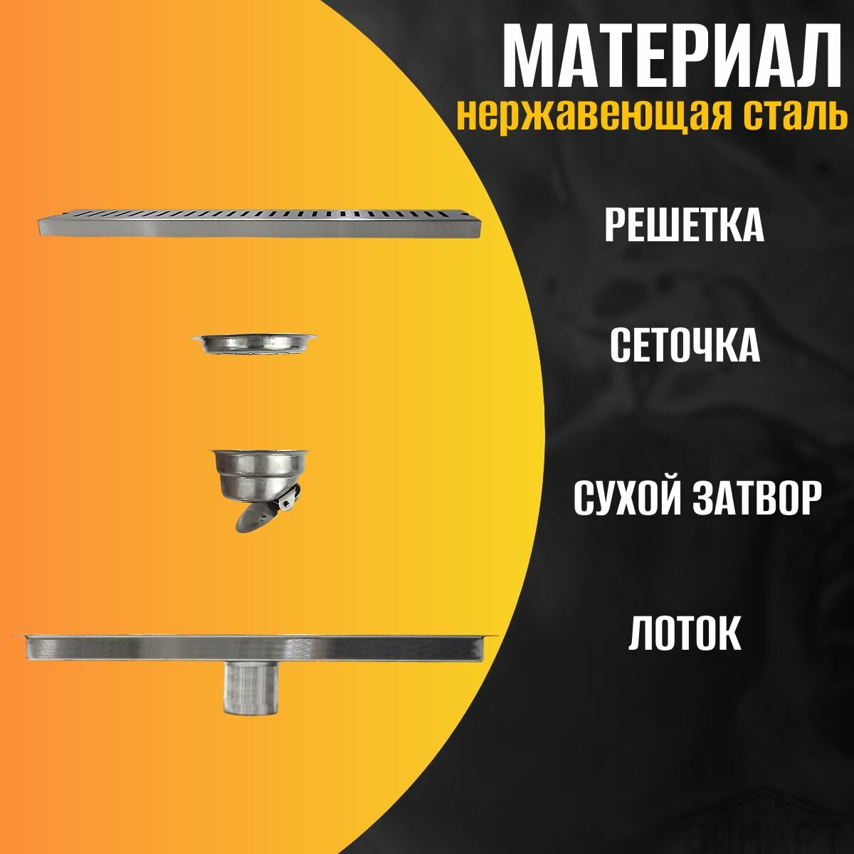 Трап душевой (лоток) с сухим затвором+гидрозатвор, 200х100 мм, из нержавеющей стали марки 304, толщина 1,0 мм, линейный, вертикальный, зазором под плитку