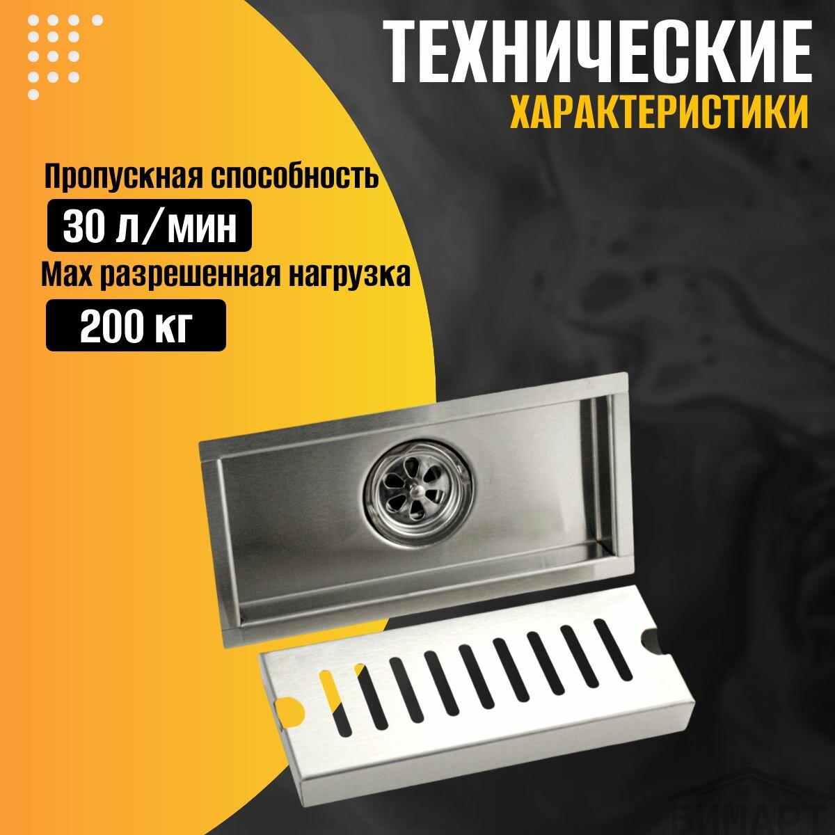 Трап линейный хром,300х100мм, душевой лоток с сухим затвором, из нержавеющей стали, с вертикальным выходом и с зазором под плитку