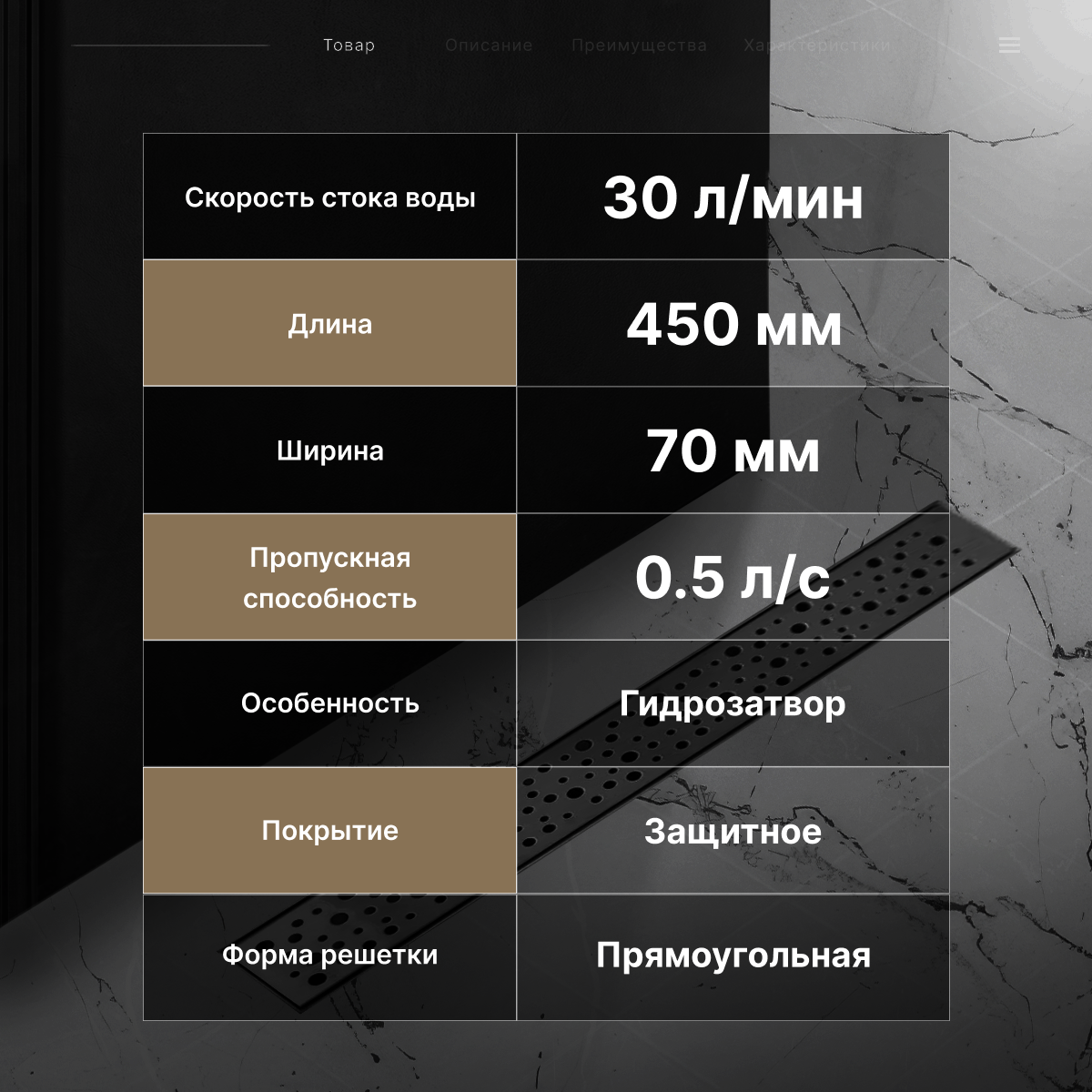 Трап для душа, душевой лоток с горизонтальным выпуском 70 мм/500 мм с сухим затвором черный TIM BAD465002BK