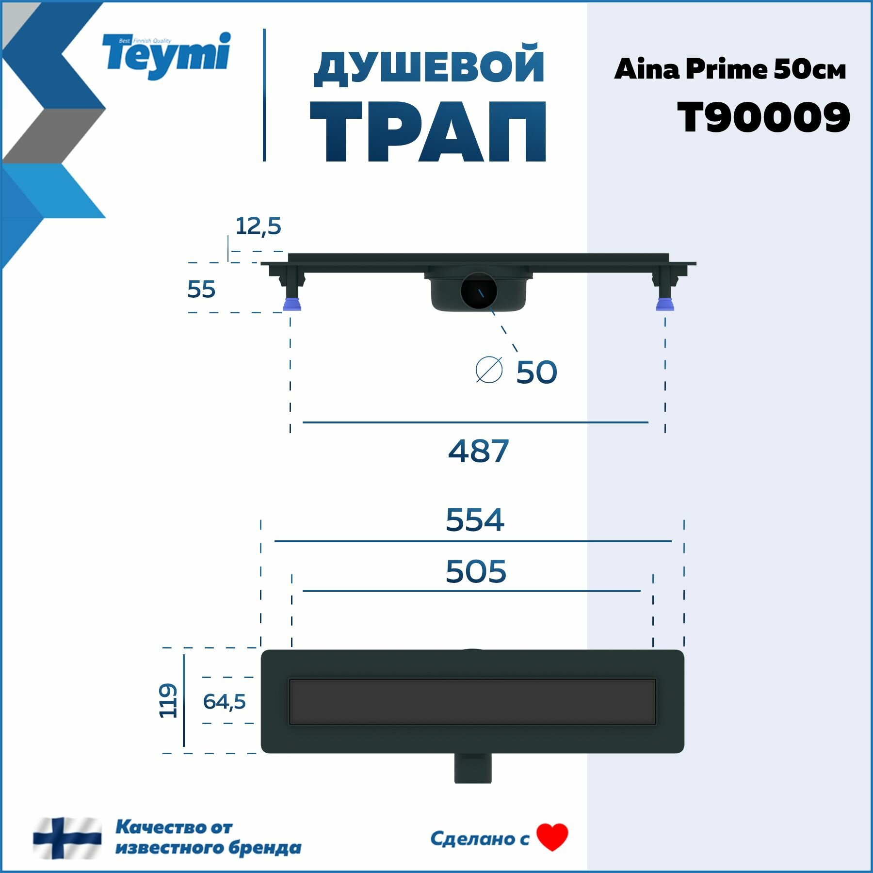 Купить Трап для душа под плитку с комбинированным гидрозатвором Teymi Aina Prime черный 50 см T90009