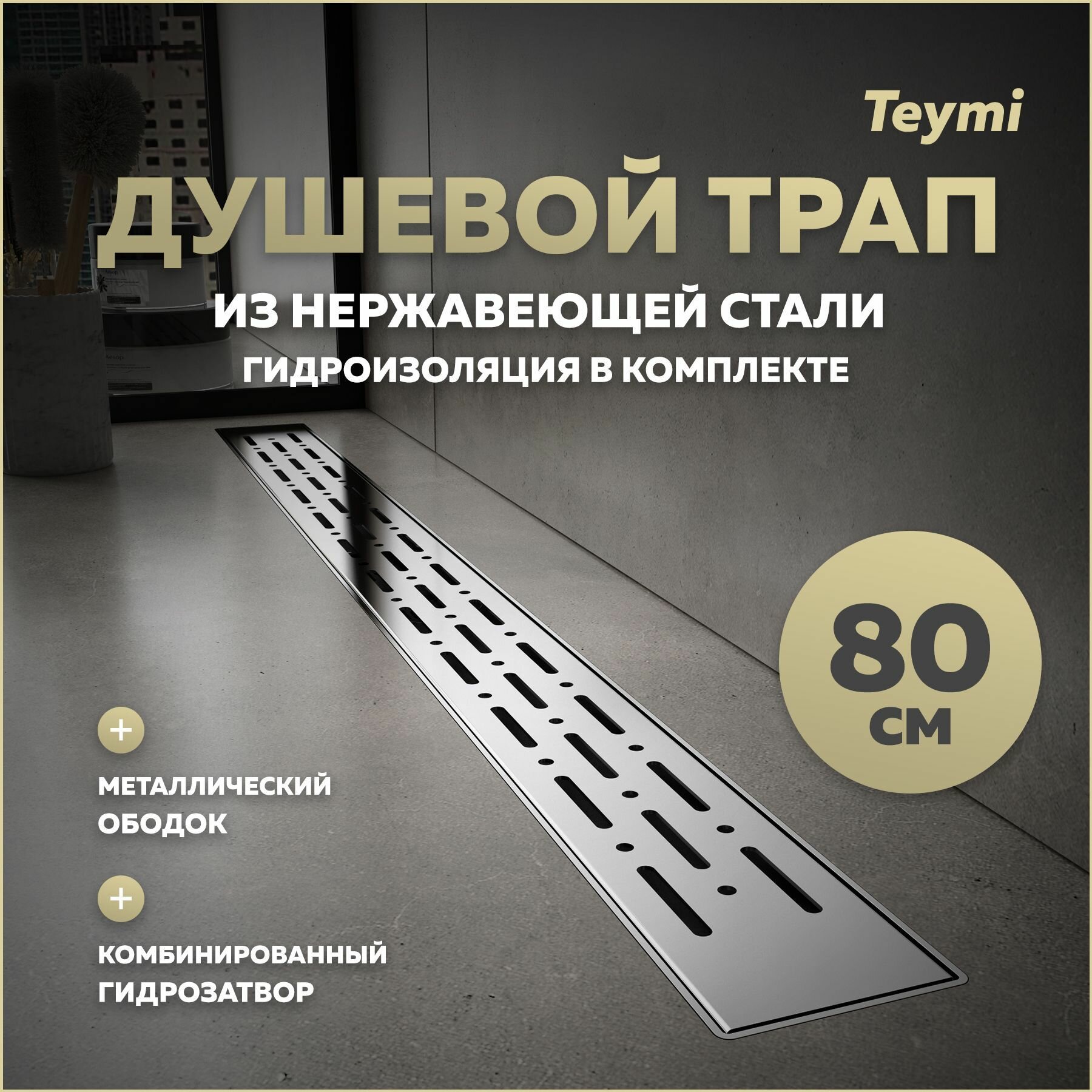 Трап для душа с комбинированным гидрозатвором Teymi Helmi Prime 80 см решетка нержавеющая сталь T90337