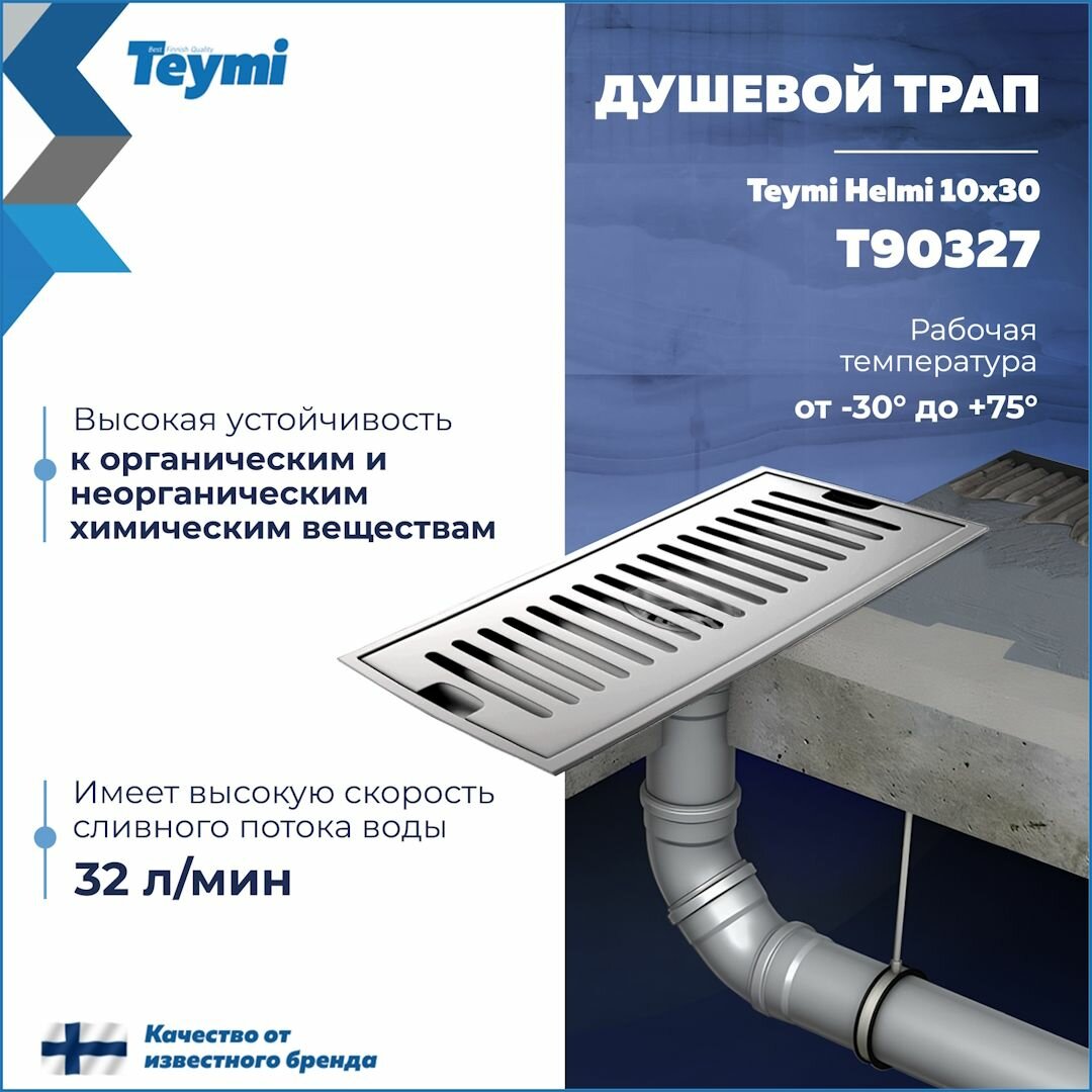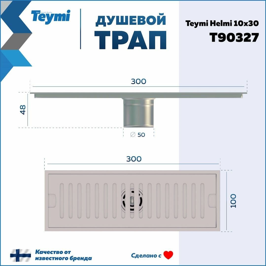 СохранитьТрап для душа с сухим затвором вертикальный выпуск Teymi Helmi 10х30 c решеткой нержавеющая сталь T90327 интересное: