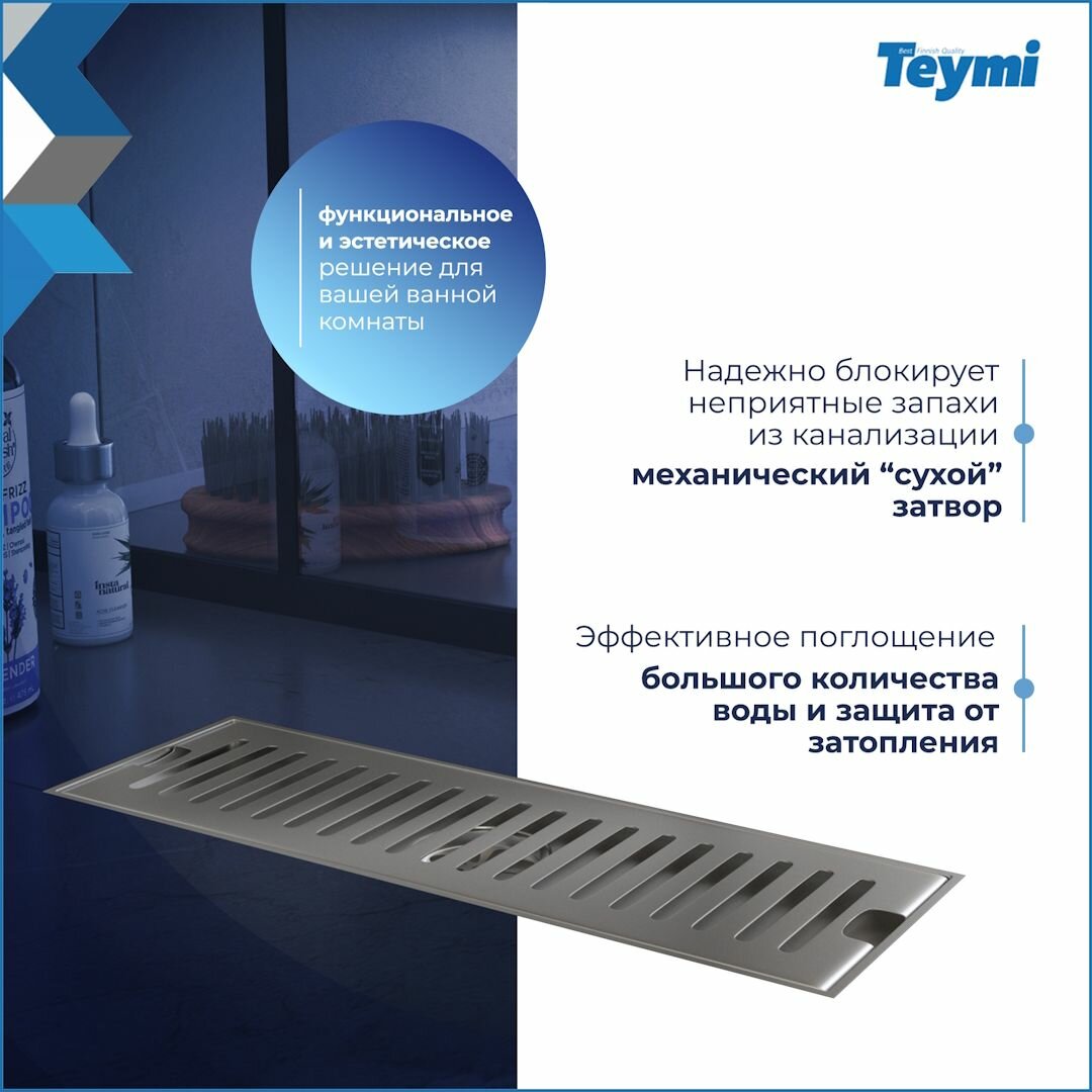 Купить Трап для душа с сухим затвором вертикальный выпуск Teymi Helmi 10х30 c решеткой нержавеющая сталь T90327