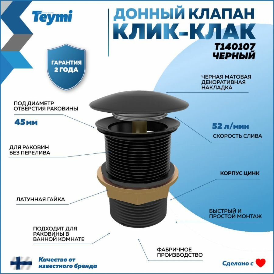 Донный клапан для раковины без перелива Teymi Solli черный матовый T140107 интересное: