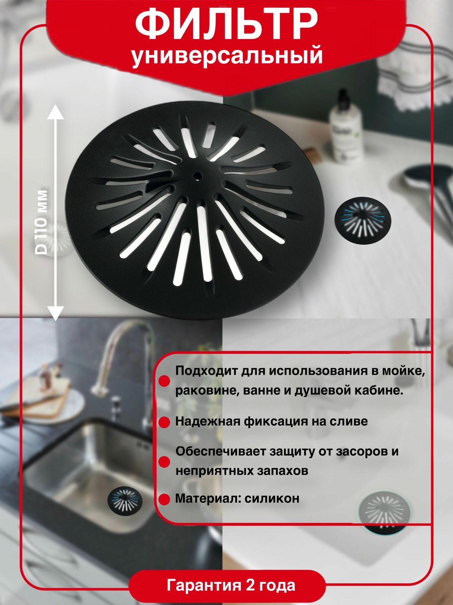 Универсальный силиконовый фильтр CATCHY WIRQUIN для мойки, раковины и ванны черный интересное: