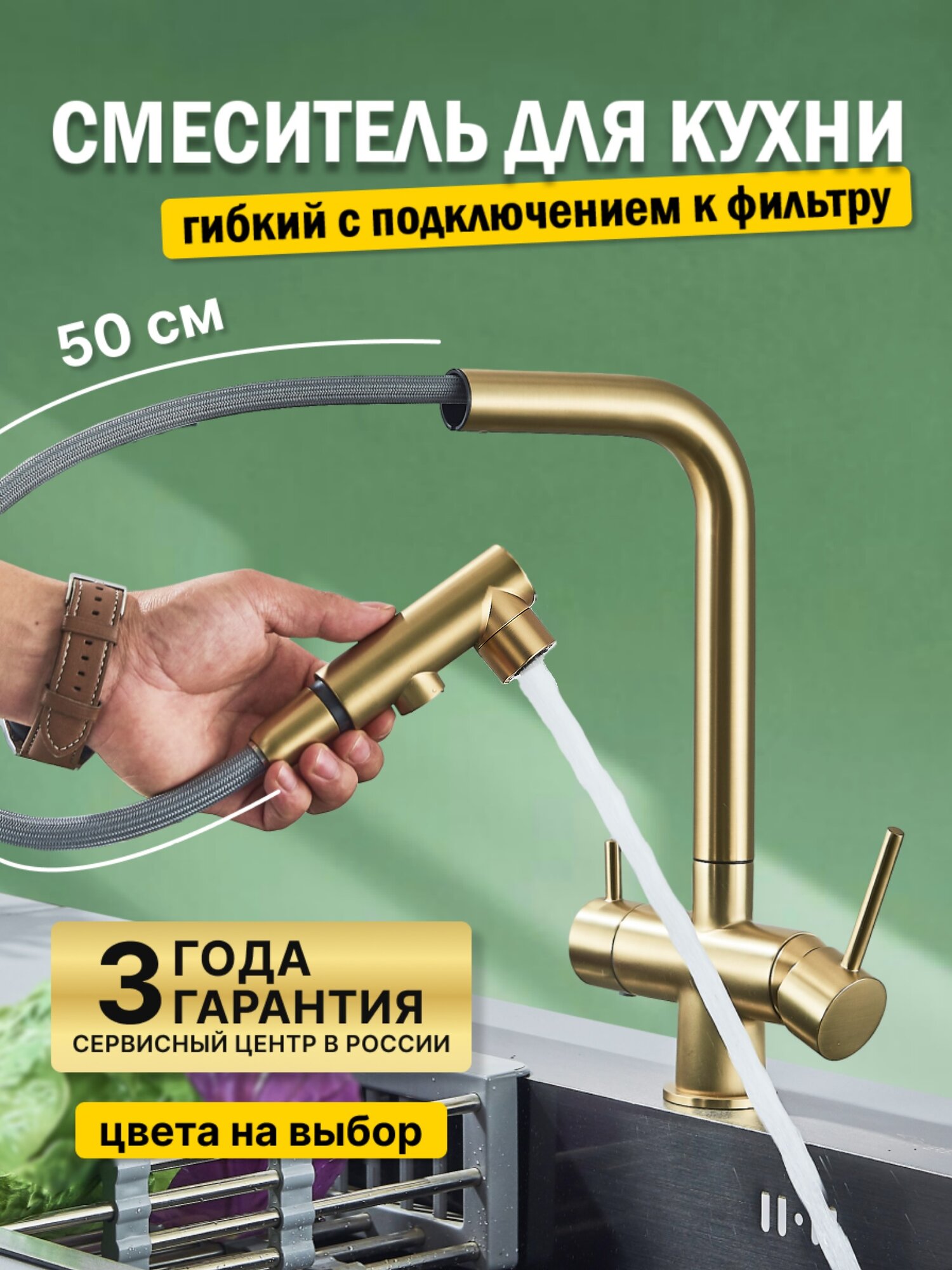 Смеситель для кухни DHome с фильтром и выдвижным изливом цвет золото интересное: