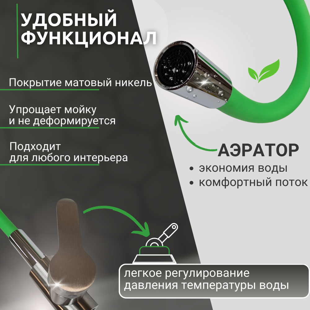 Купить Смеситель для кухни, с гибким изливом зелёного цвета, корпус из нержавеющей стали, цвет хром, Искусство Потока
