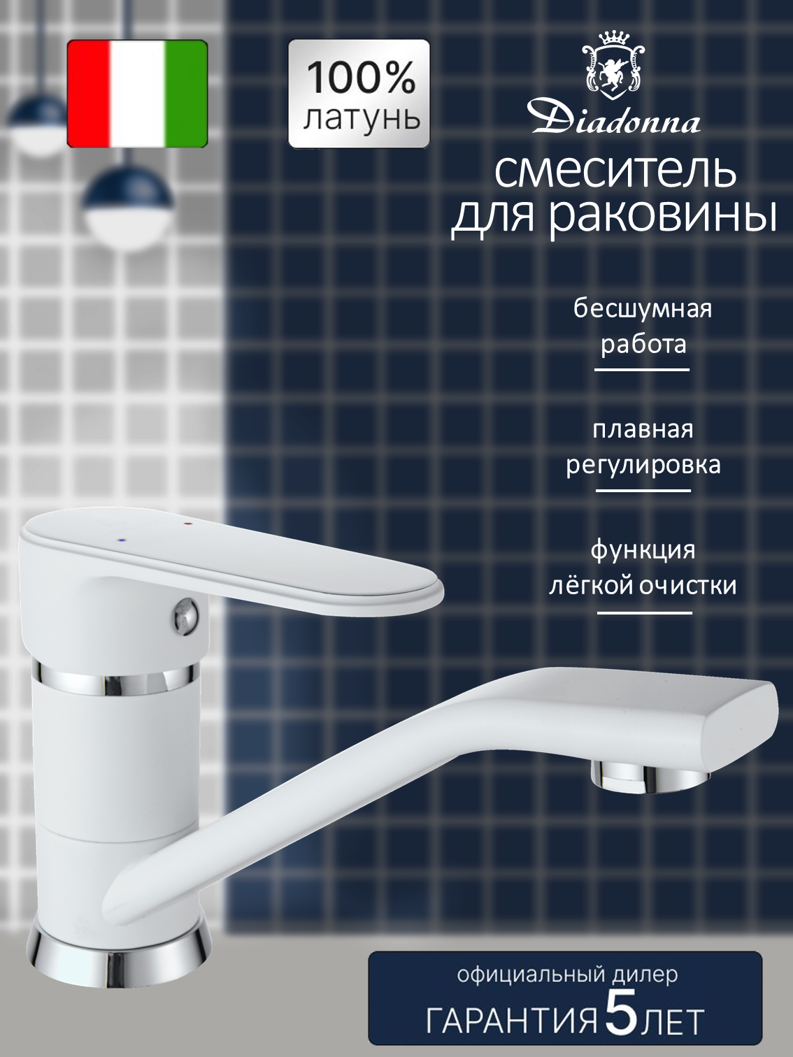 Смеситель на раковину Diadonna D87-448117W с поворотным изливом, картридж 35 мм, белый, крепление гайка интересное: