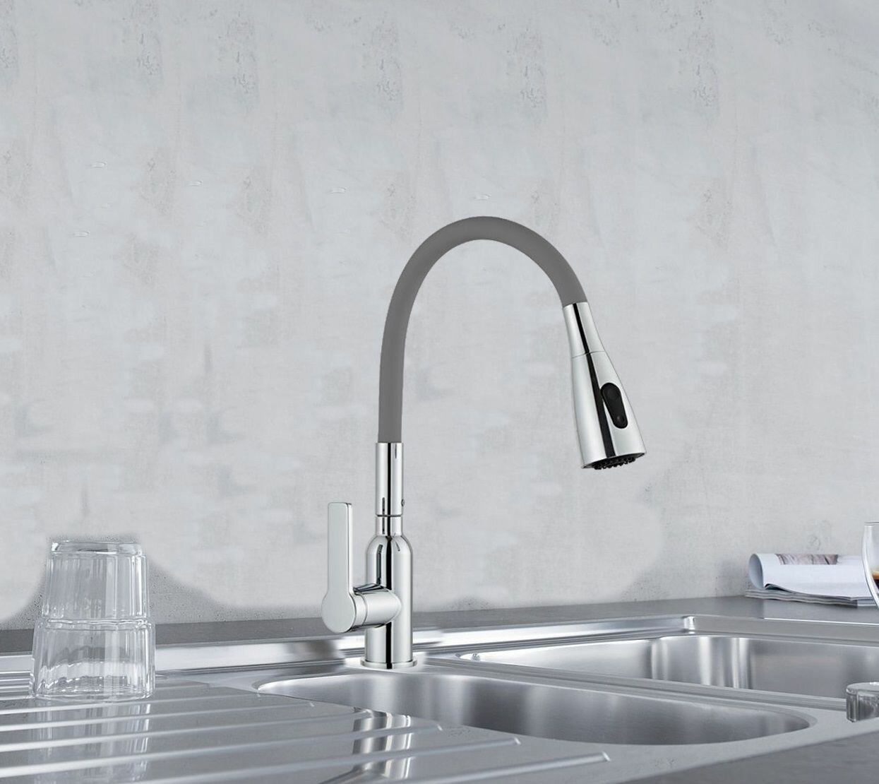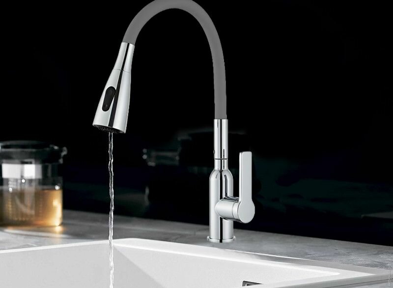 Смеситель для кухни латунный YINDAF PREMIUM с гибким серым изливом и картриджным управлением интересное: