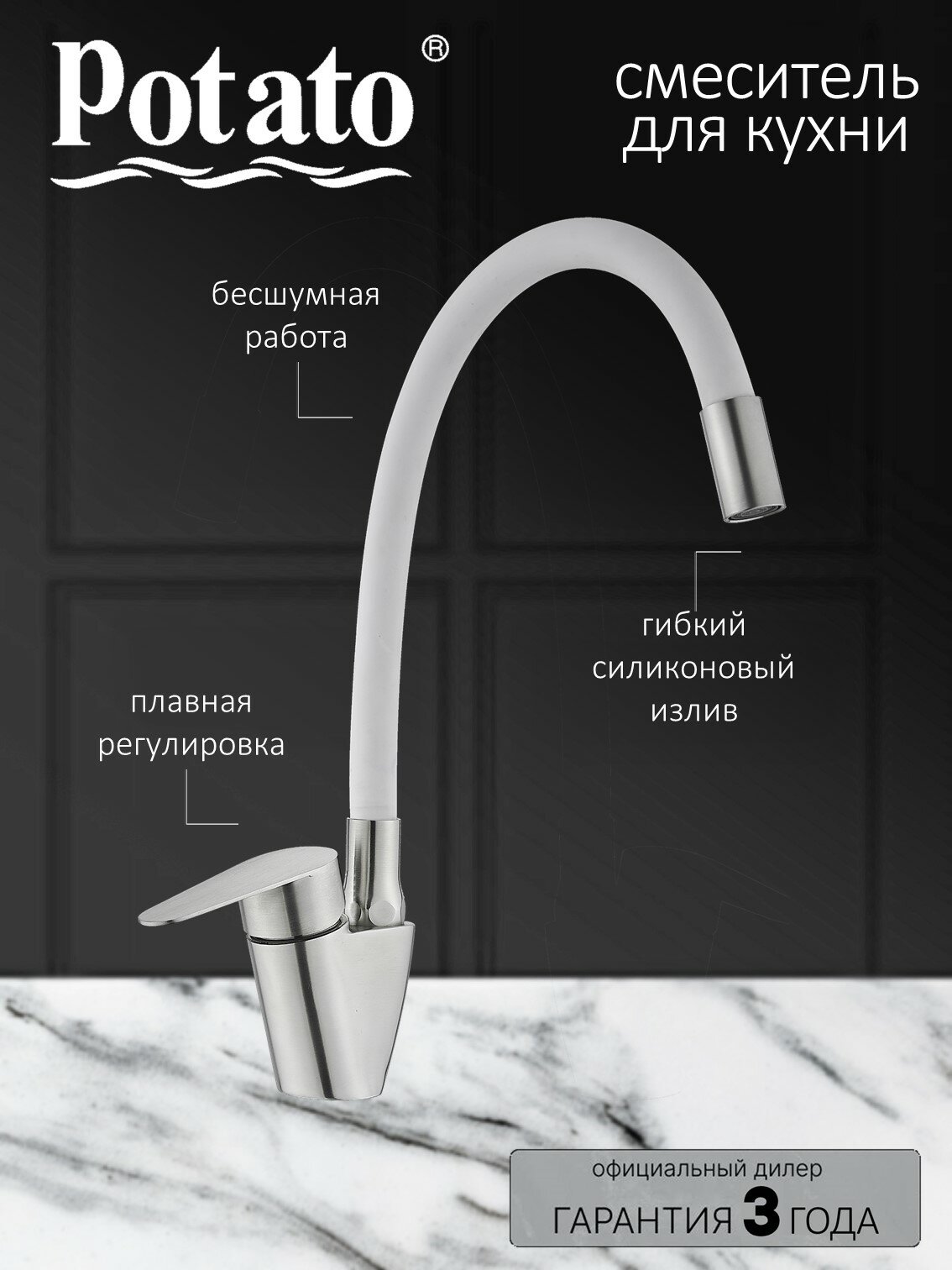 Смеситель на кухню Potato P57310S-7 с гибким белым изливом, картридж 35 мм, нержавейка, крепление гайка интересное: