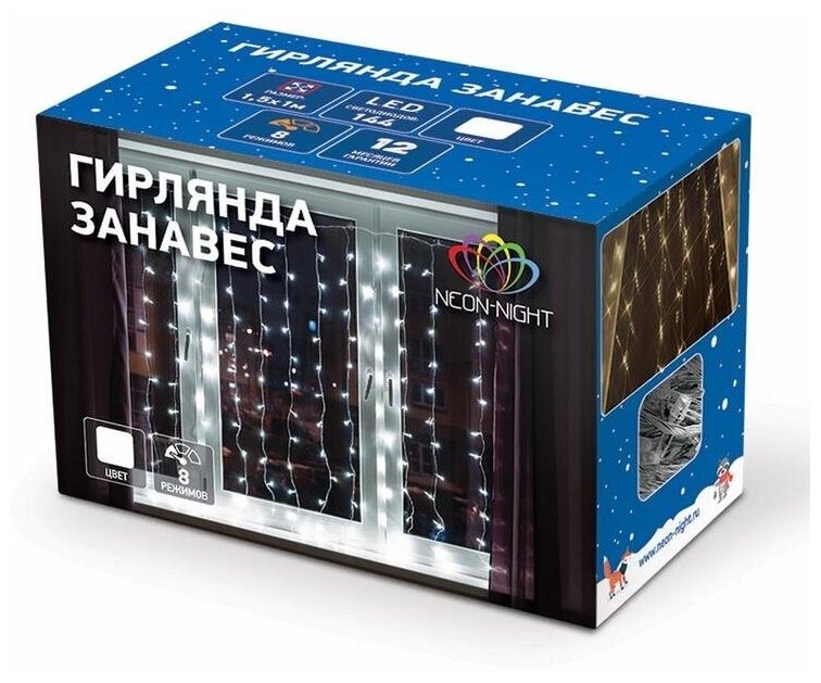 Гирлянда новогодняя светодиодная Neon-Night Дождь-штора 144 LED, 1,5х1,5м с контроллером, холодное белое свечение