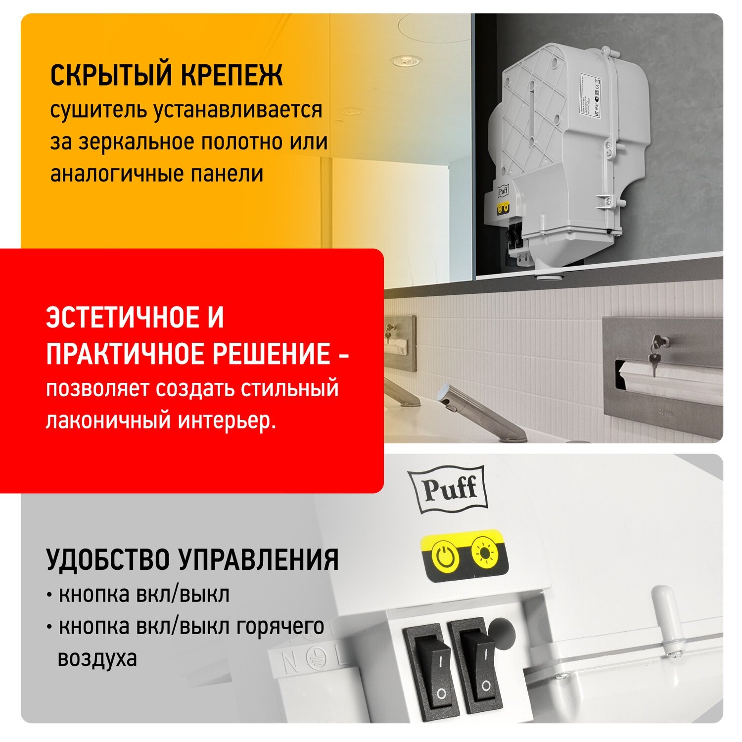 Электросушитель для рук Puff-8821 мощность 1200Вт, скрытый монтаж, Арт: 1401.413 интересное: