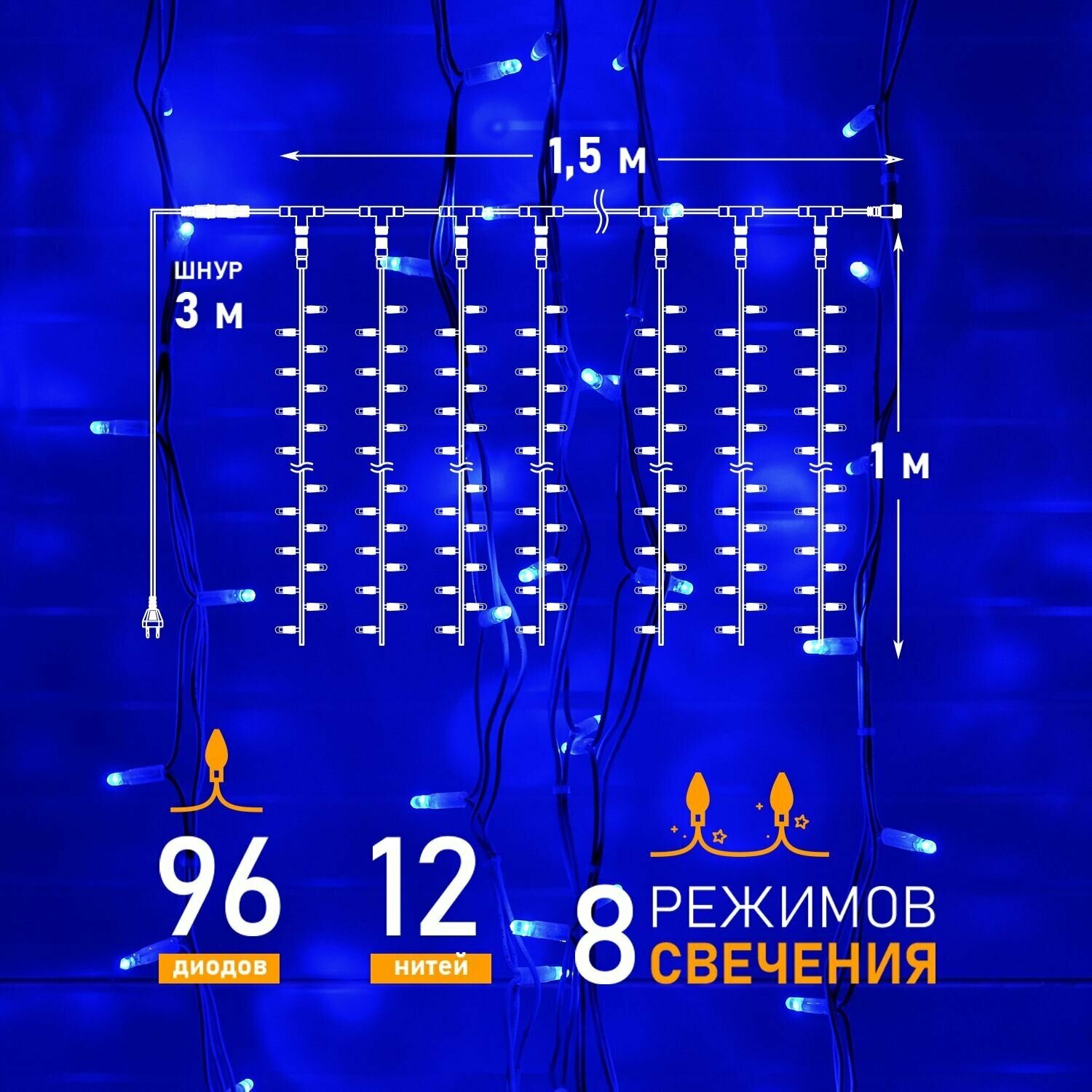 Светодиодная гирлянда Neon-night "Дождь" 1.5х1 м, 8 режимов, 96 синих светодиодов, прозрачный провод