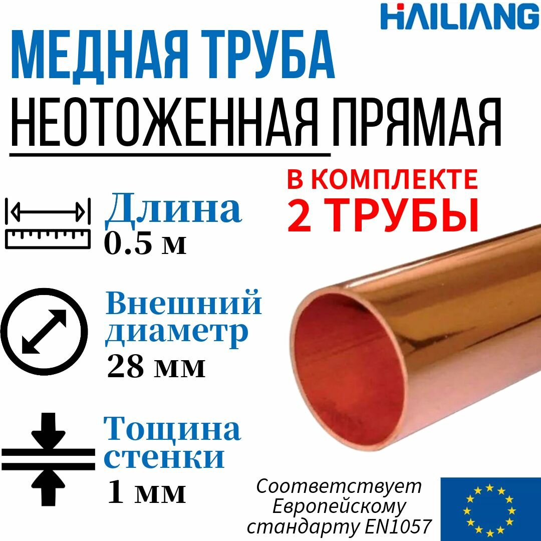 Купить Медная труба неотоженная, прямая (в штангах), Дн 28x1 мм - 0.5 метра, 2 штуки, Hailiang.