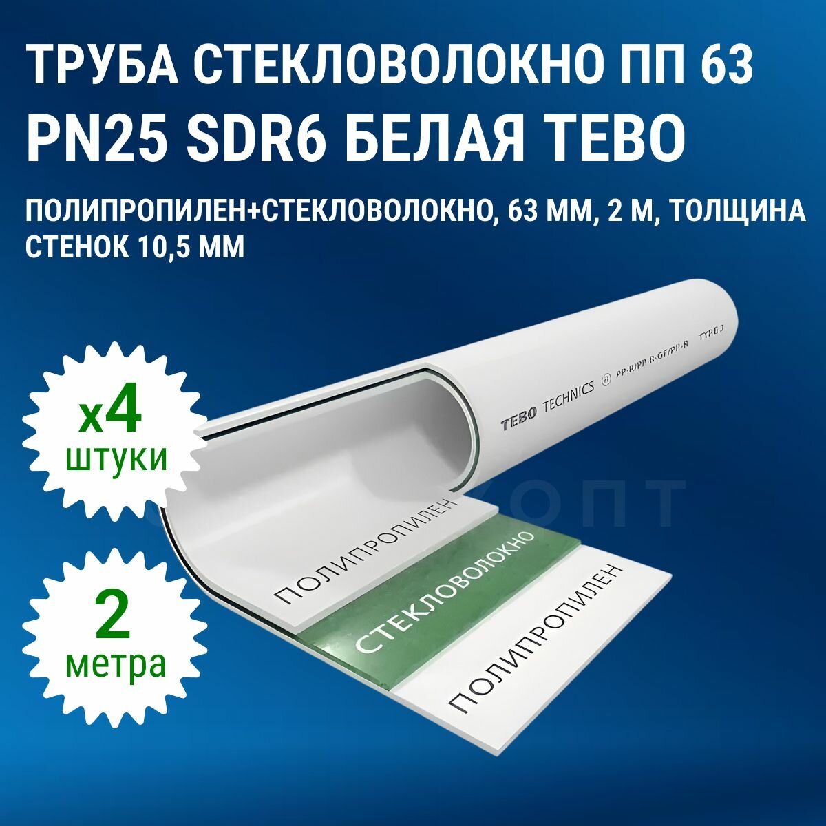 Труба стекловолокно ПП (полипропилен) 63 PN25 SDR6 белая Tebo 4 метра (2 штуки по 2 метра)