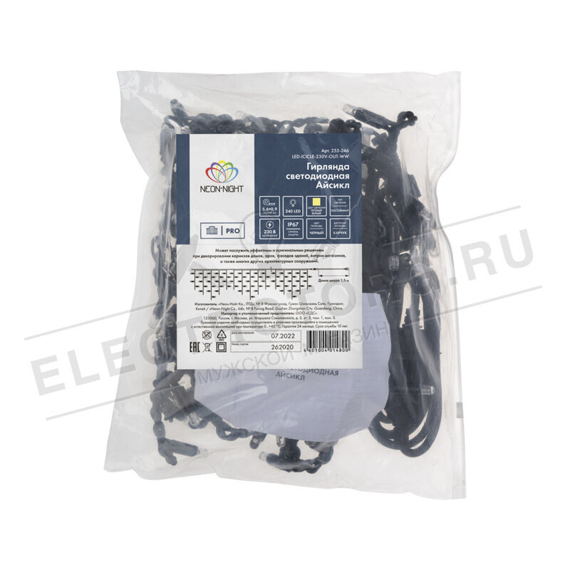 Гирлянда NEON-NIGHT 255-241 айсикл (бахрома) светодиодный, 5,6 х 0,9 м, черный провод каучук, 230 В, диоды желтые, 240 LED