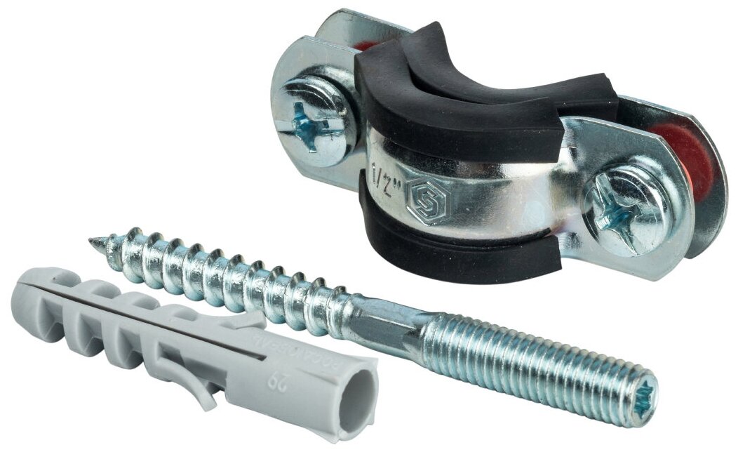 СохранитьSTOUT Хомут для труб, комплект: хомут+шпилька шуруп +дюбель пластиковый 1/2"(20-24) интересное: