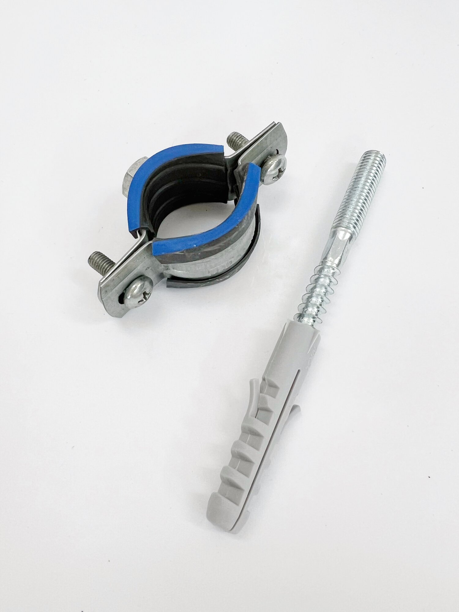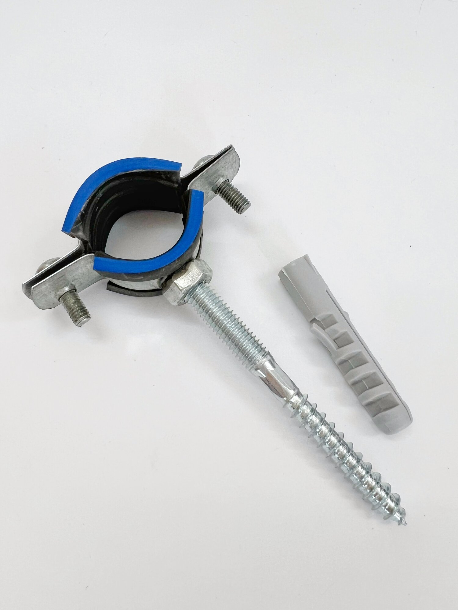 Купить Хомут трубный с резиновым профилем 3/4"(25-30) М8 в комплекте дюбель распорный 10х50 и шуруп шпилька 8х80 (10 шт.)