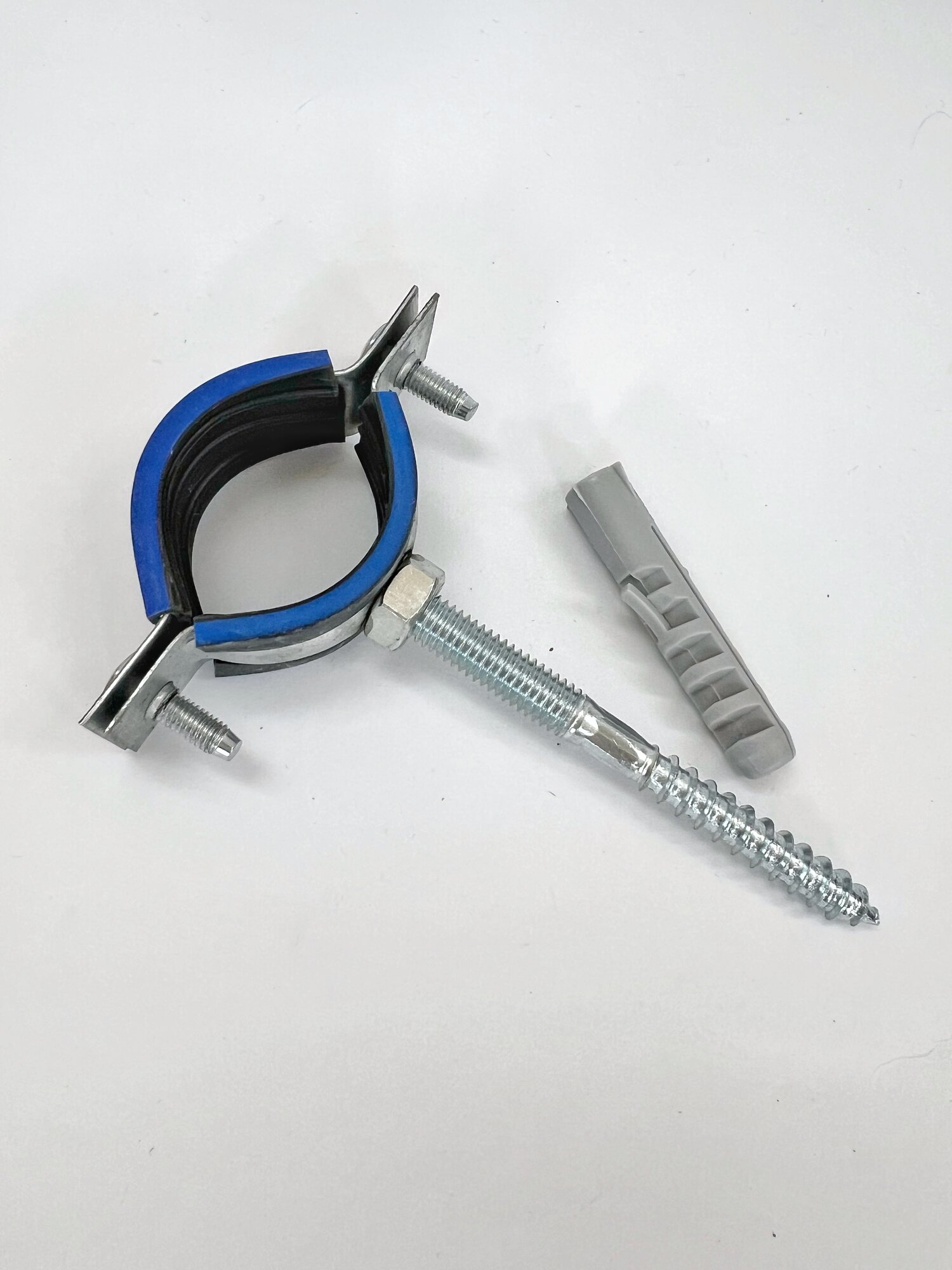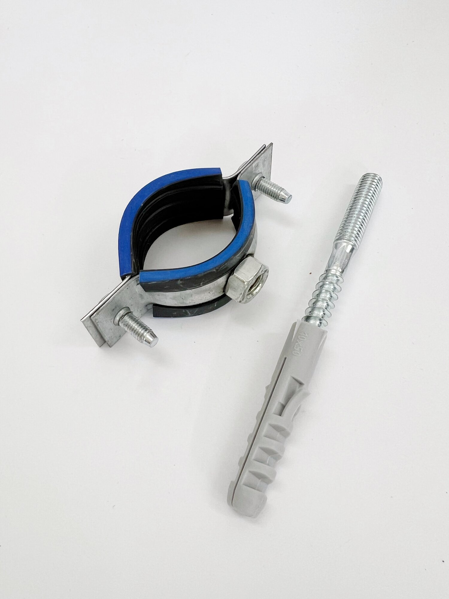 Купить Хомут трубный с резиновым профилем 1"(32-38) М8 в комплекте дюбель распорный 10х50 и шуруп шпилька 8х80 (10 шт.)