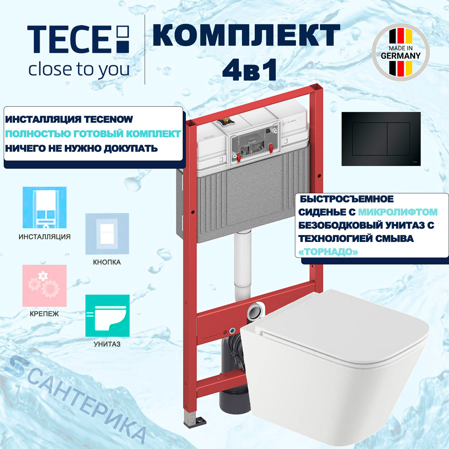 Инсталляция Tece TECEnow 9400412 с подвесным унитазом Santerika SAN. UNT.01, смыв "Торнадо", сиденье микролифт
