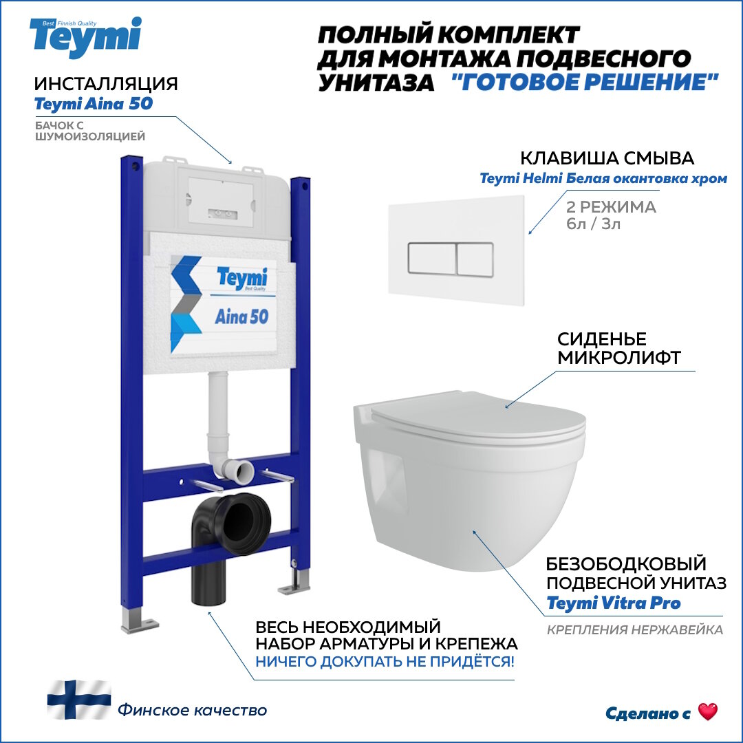 Инсталляция с унитазом комплект 5 в 1 Teymi унитаз подвесной безободковый Vitra Pro кнопка хром F00676