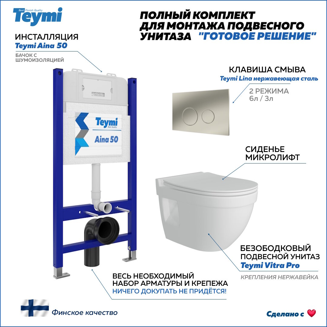 Инсталляция с унитазом комплект 5 в 1 Teymi унитаз подвесной безободковый Vitra Pro кнопка нержавеющая сталь F13482