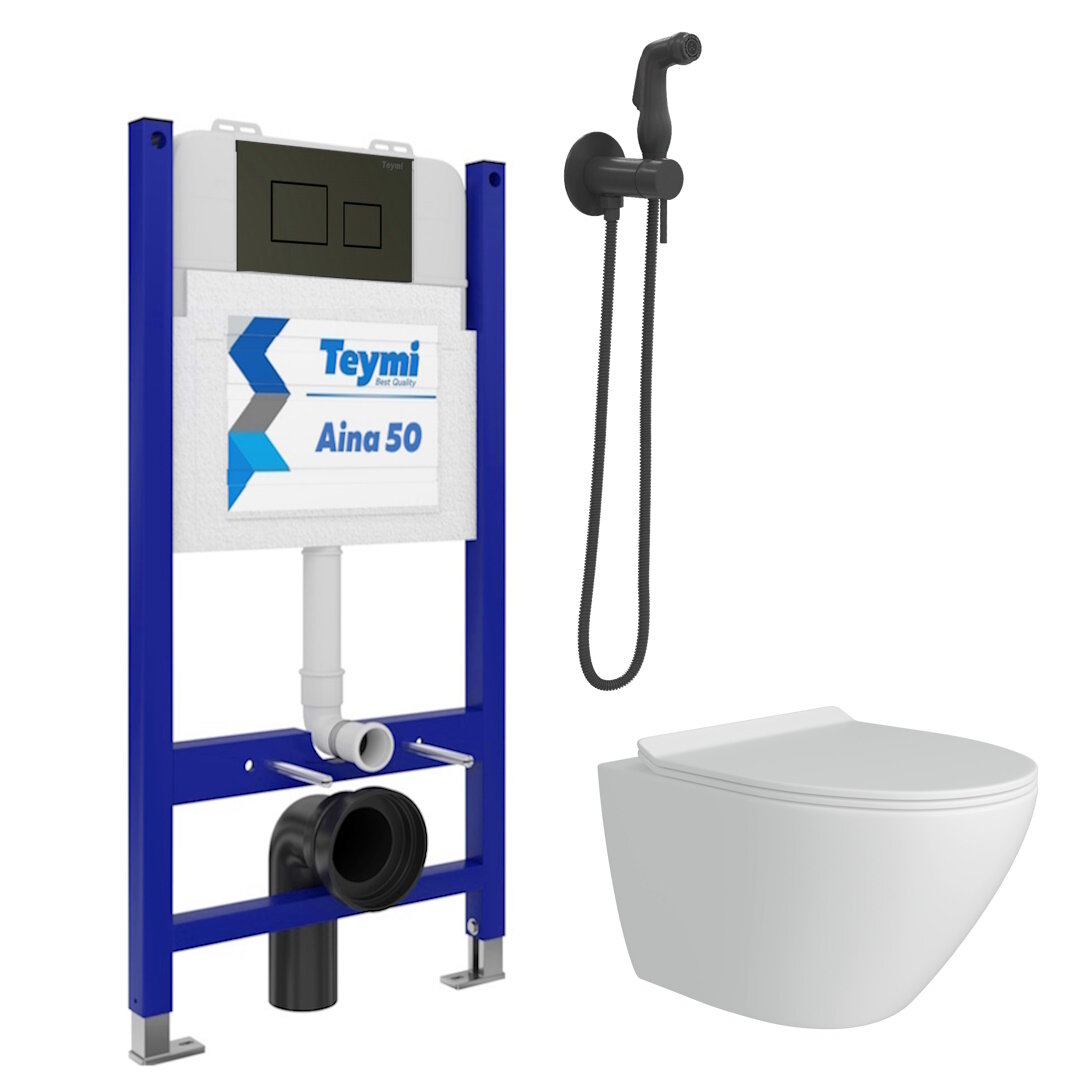 Инсталляция с унитазом комплект 6 в 1 Teymi унитаз подвесной безободковый Lina Pro кнопка черная гигиенический душ черный F08490
