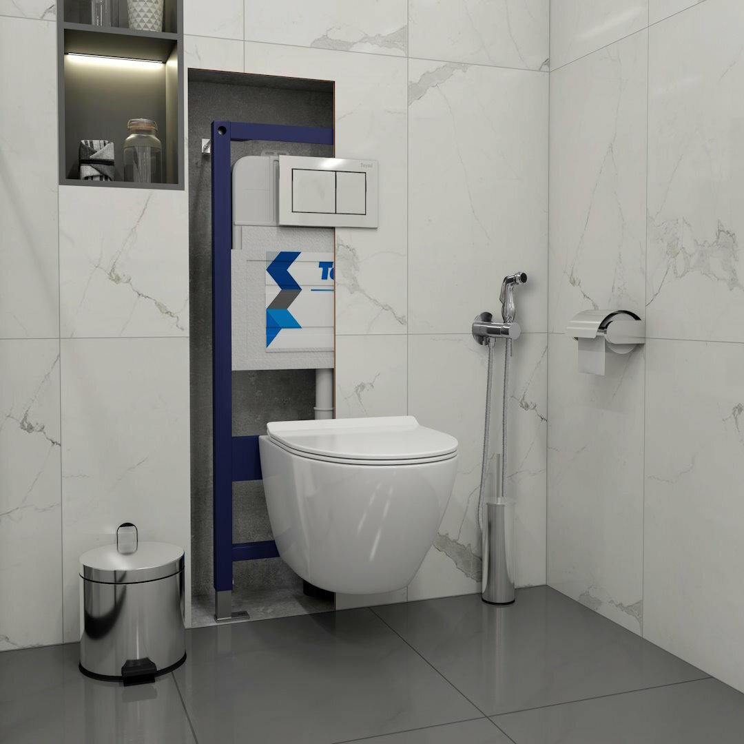 Инсталляция с унитазом комплект 6 в 1 Teymi унитаз подвесной безободковый Lina Pro кнопка белая гигиенический душ хром F08488