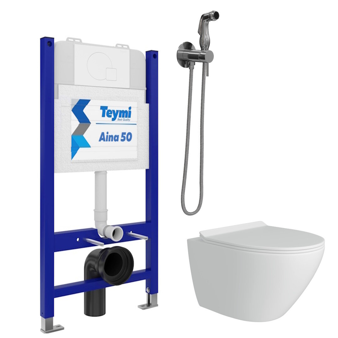 Инсталляция с унитазом комплект 6 в 1 Teymi унитаз подвесной безободковый Lina Pro кнопка белая гигиенический душ хром F08488