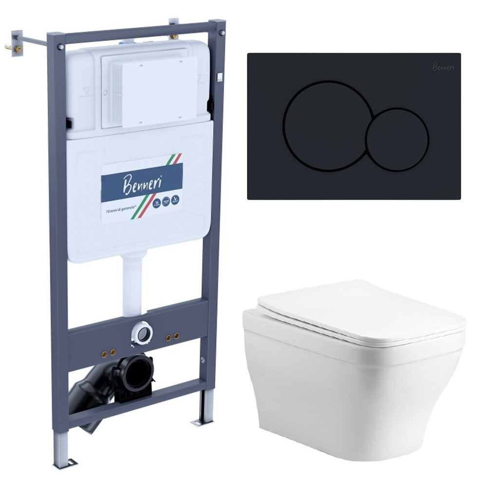 Комплект Инсталляция Benneri+унитаз подвесной Амадео безободковый, с микролифтом+кнопка смыва Benneri Luna черная