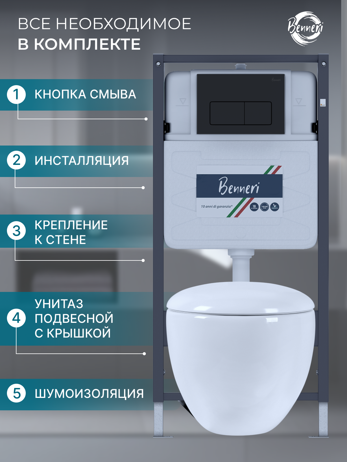 Комплект Инсталляция Benneri+унитаз подвесной Амадео безободковый, с микролифтом+кнопка смыва Benneri Luna черная