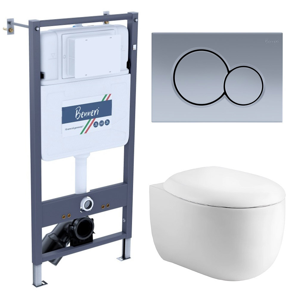 Комплект Инсталляция Benneri+унитаз подвесной Aquatek АЛЬТАИР безободковый, с микролифтом+кнопка смыва Luna хром матовая