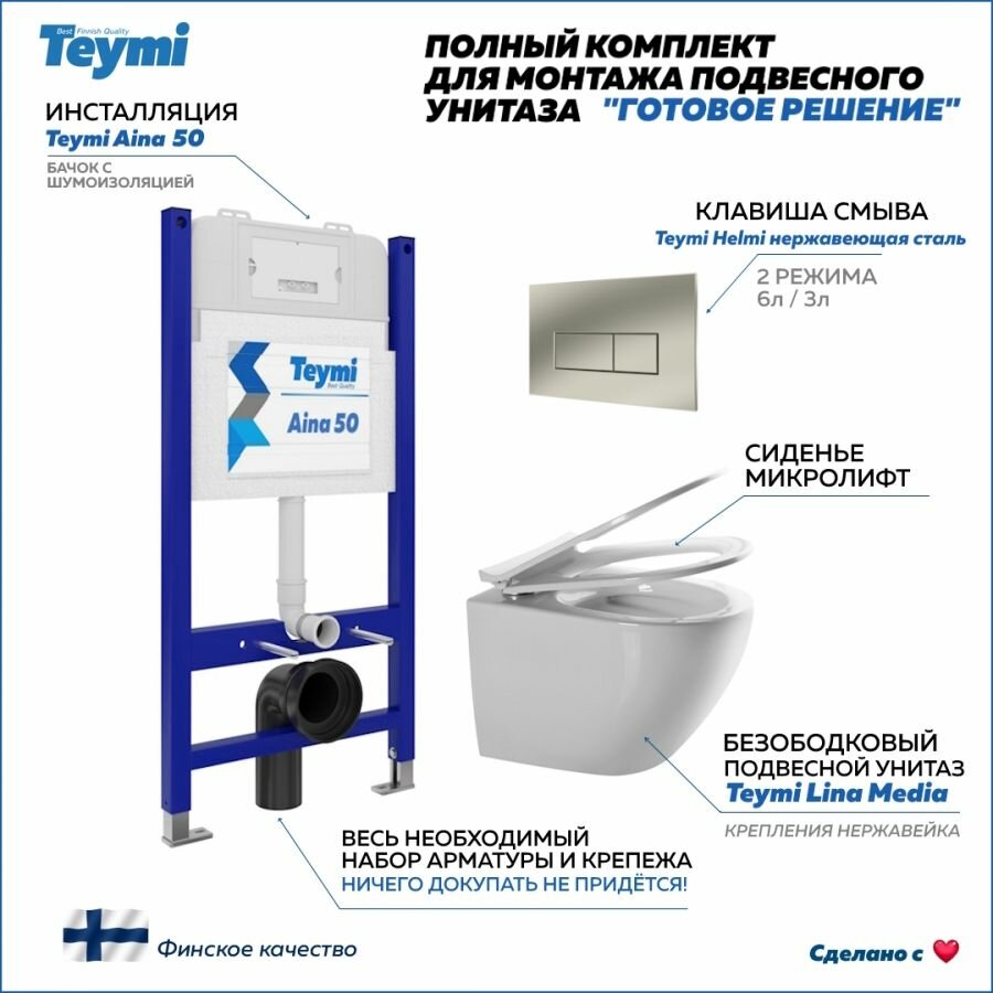 Инсталляция с унитазом комплект 5 в 1 Teymi унитаз подвесной безободковый Lina Media кнопка нержавеющая сталь F13322