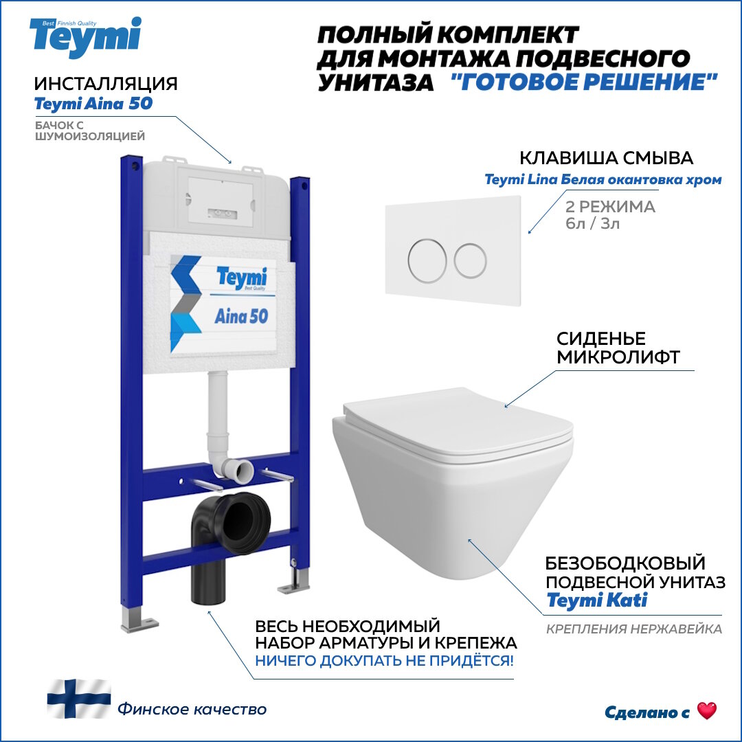 Инсталляция с унитазом комплект 5 в 1 Teymi унитаз подвесной безободковый Kati кнопка хром F00631