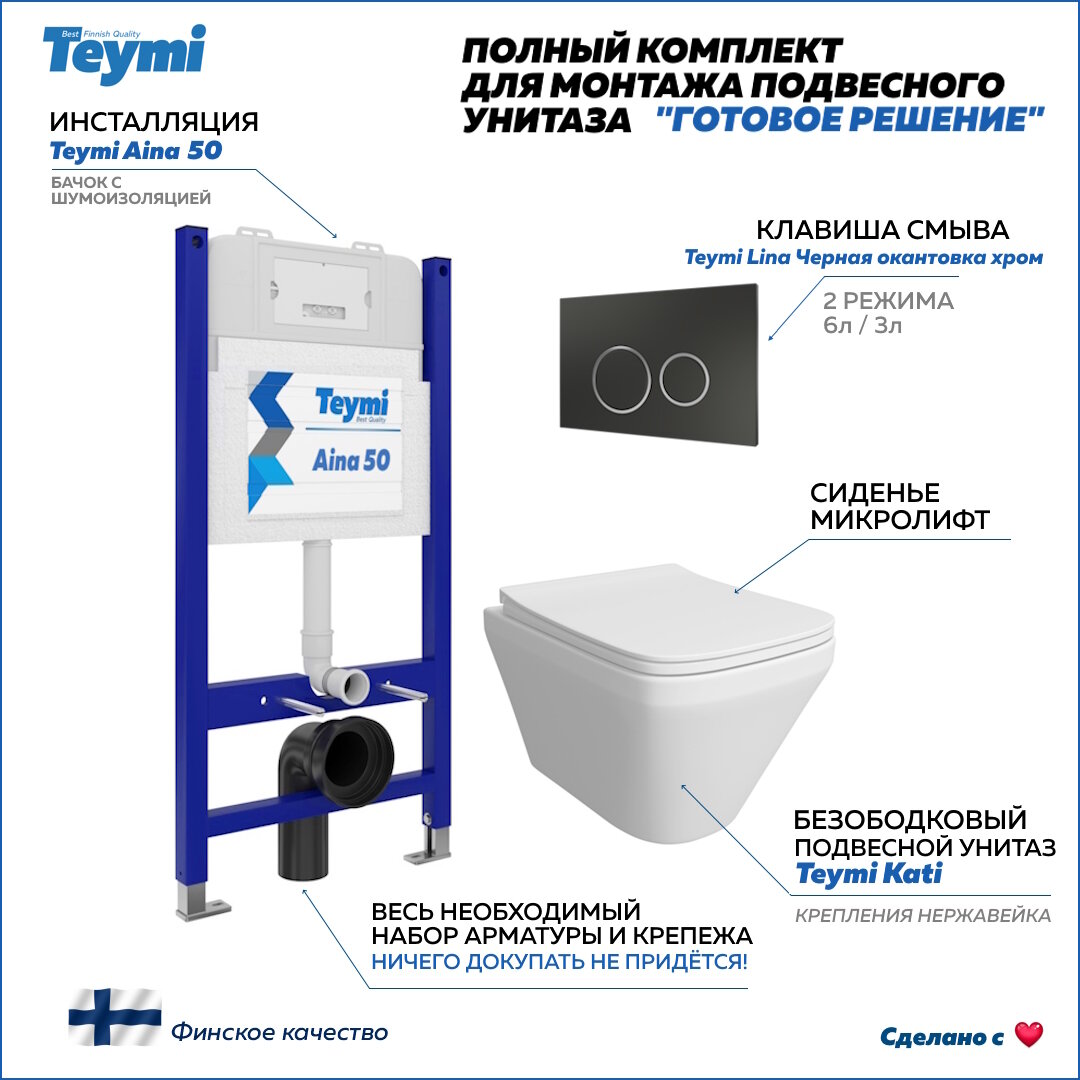 Ниже Вы можете прочитать отзывы на Инсталляция с унитазом комплект 5 в 1 Teymi унитаз подвесной безободковый Kati кнопка черная / хром F13459, ознакомится с подробными характеристиками, посмотреть интересные обзоры и фотографии на Инсталляция с унитазом комплект 5 в 1 Teymi унитаз подвесной безободковый Kati кнопка черная / хром F13459.
