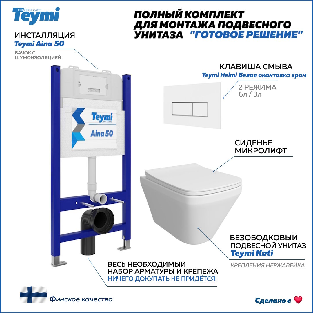 Инсталляция с унитазом комплект 5 в 1 Teymi унитаз подвесной безободковый Kati кнопка белая / хром F13460