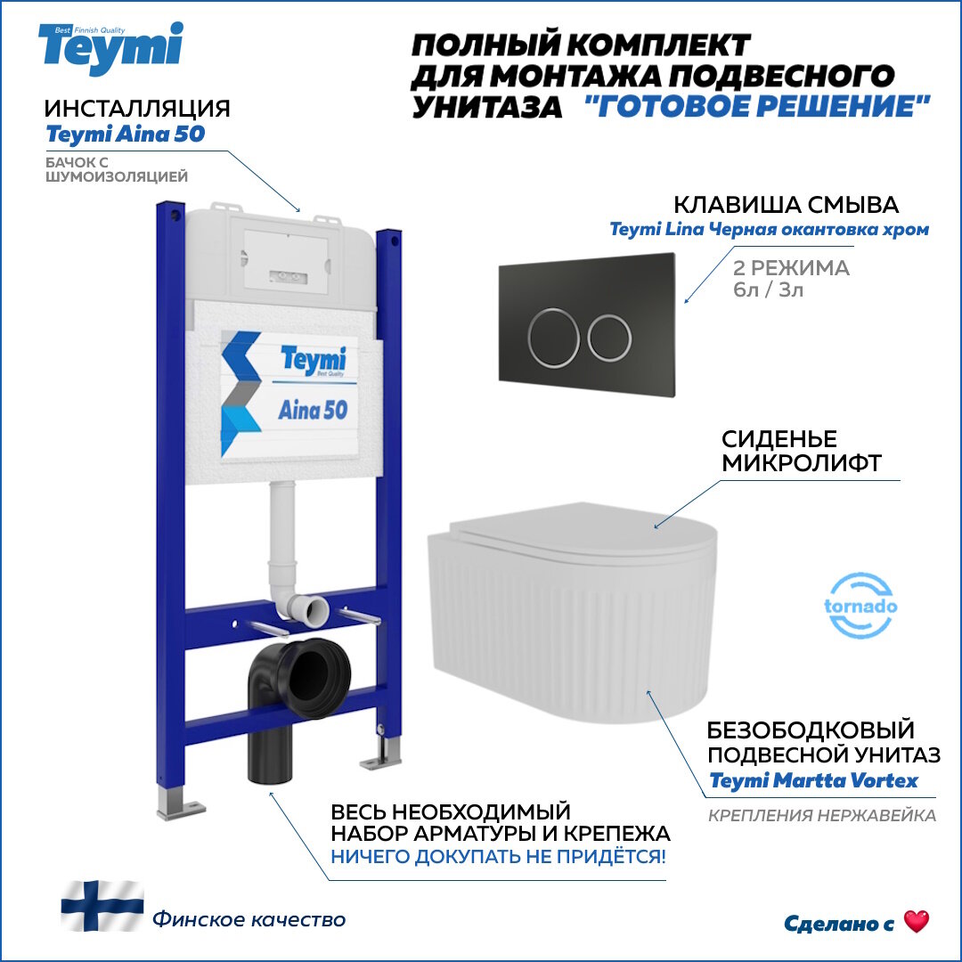 Инсталляция с унитазом комплект 5 в 1 Teymi унитаз подвесной безободковый торнадо Martta Vortex кнопка черная / хром F14540
