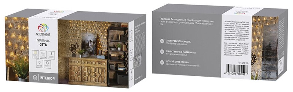 Светодиодная гирлянда NEON-NIGHT Сеть 1.8х1.5 м 8 режимов тепло-белое свечение 215-136