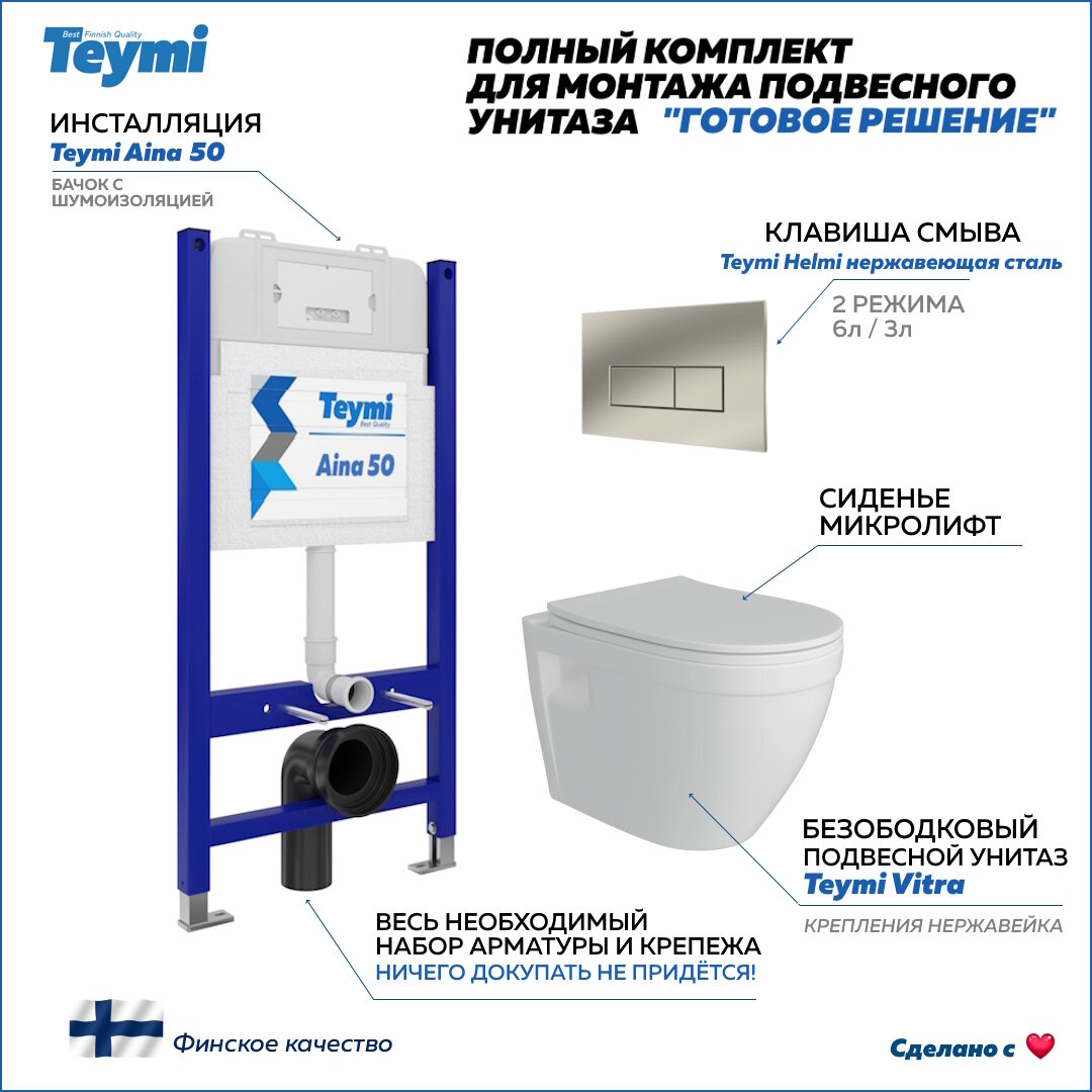Инсталляция с унитазом комплект 5 в 1 Teymi унитаз подвесной безободковый Vitra кнопка нержавеющая сталь F13486