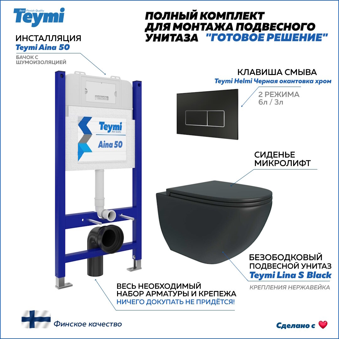 СохранитьИнсталляция с унитазом комплект 5 в 1 Teymi унитаз подвесной безободковый черный Lina S Black кнопка черная / хром F13519 интересное: