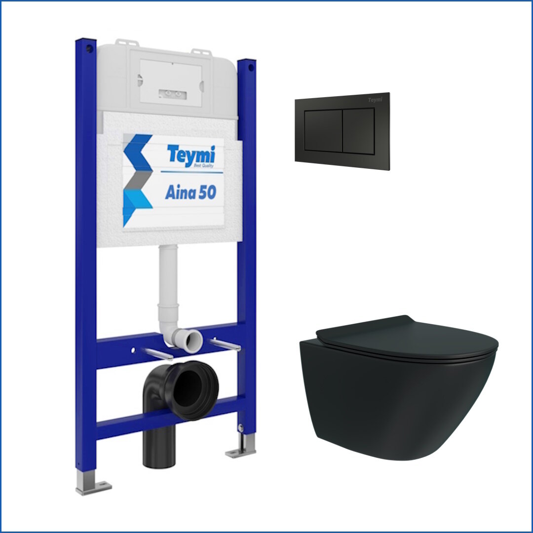 Инсталляция с унитазом комплект 5 в 1 Teymi унитаз подвесной безободковый торнадо черный Lina Pro Vortex Black кнопка черная F15001