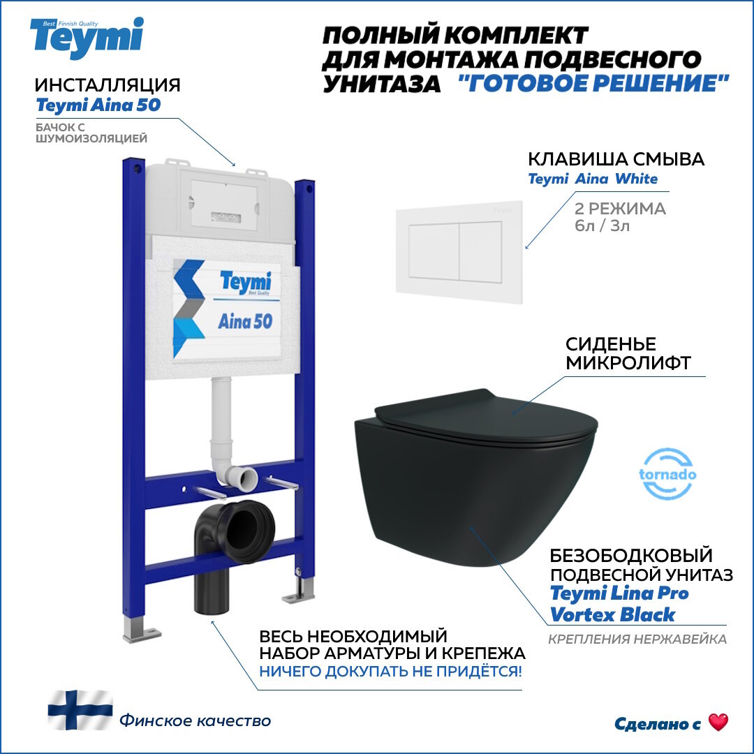 Инсталляция с унитазом комплект 5 в 1 Teymi унитаз подвесной безободковый торнадо черный Lina Pro Vortex Black кнопка белая F14999