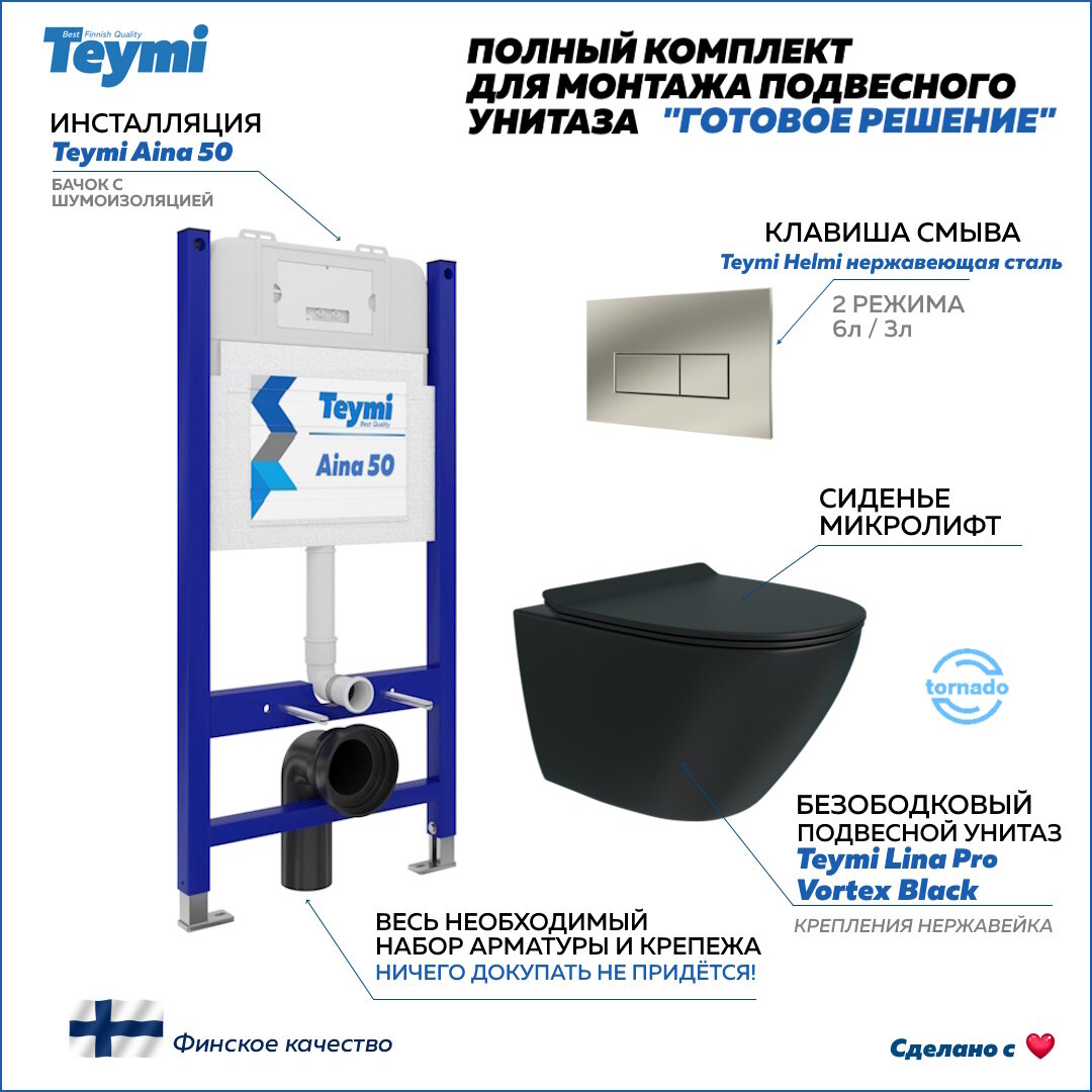 Купить Инсталляция с унитазом комплект 5 в 1 Teymi унитаз подвесной безободковый торнадо черный Lina Pro Vortex Black кнопка нержавеющая сталь F14984