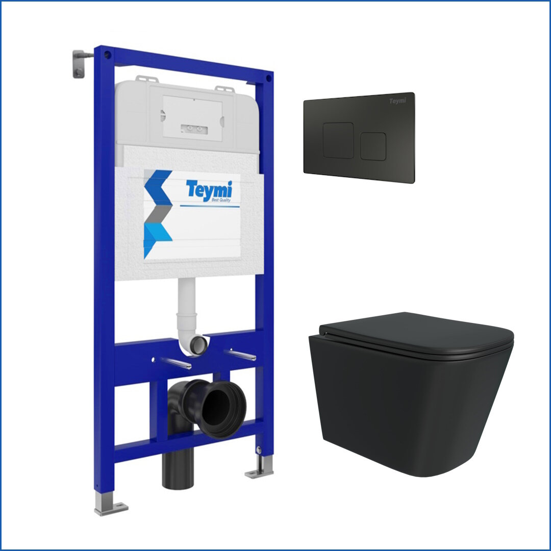 Инсталляция с унитазом комплект 5 в 1 Teymi унитаз подвесной безободковый черный Helmi Black кнопка нержавеющая сталь F13346