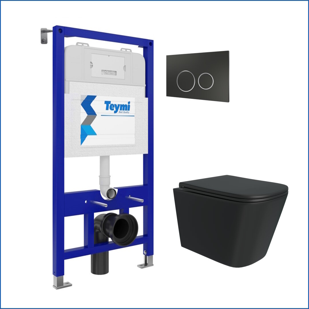 Инсталляция с унитазом комплект 5 в 1 Teymi унитаз подвесной безободковый черный Helmi Black кнопка черная T70794