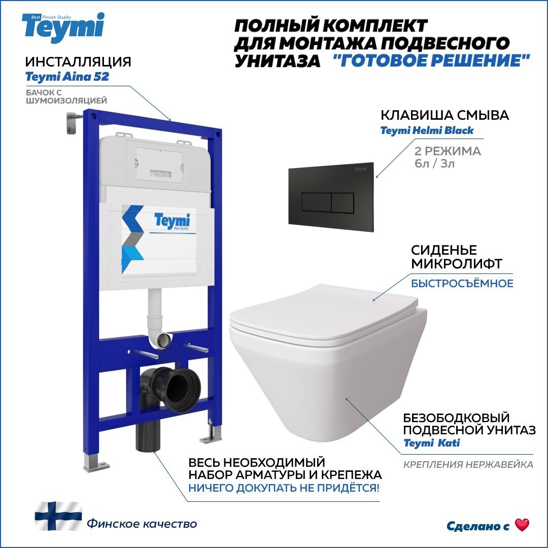 СохранитьИнсталляция с унитазом комплект 5 в 1 Teymi унитаз подвесной безободковый Kati кнопка черная T70774 интересное:
